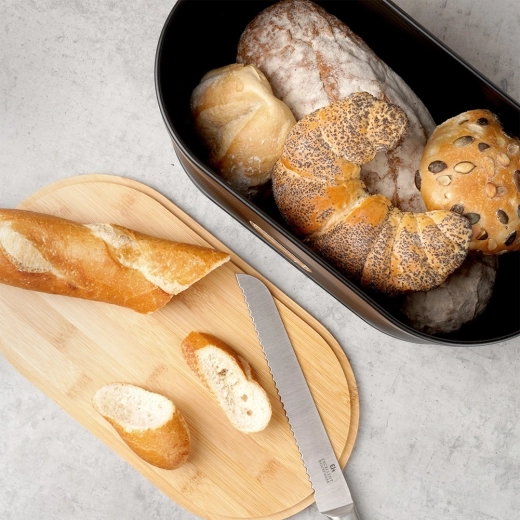 Den ovale brødkasse begrænser lufttilførslen og beskytter bagværk mod udtørring. Ideelle mål 34 × 18,5 × 15 cm til daglige forsyninger.