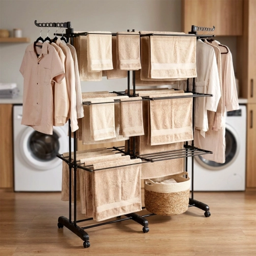 Den robuste ramme af pulverlakeret metal er modstandsdygtig over for fugt, og takket være de kraftige stænger deformeres den ikke under belastning. Den teleskopiske bredde på 75–135 cm sparer plads, mens 6 hjul (3 med bremse) sikrer nem flytning og stabil låsning på stedet.