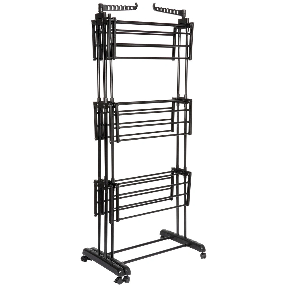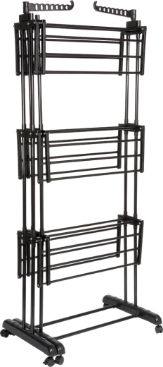 Det vertikale XXL-tørrestativ i elegant sort er ideelt til lejlighed, vaskerum og altan. Tre uafhængige niveauer og seks separat nedklappelige vinger gør det nemt at tilpasse pladsen til både længde og mængde af tøj. På siderne finder du arme med huller til bøjler, nederst en praktisk hylde f.eks. til sko.