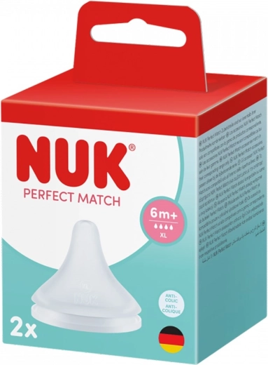 NUK Perfect Match XL sutten er lavet af blød silikone og er beregnet til børn fra 6 måneder. Den tilbyder antikolik-funktion, jævn gennemstrømning og bred læbestøtte, der minder om hudens følelse på moderens bryst. Pakken indeholder 2 stk., og sutten er uden BPA.