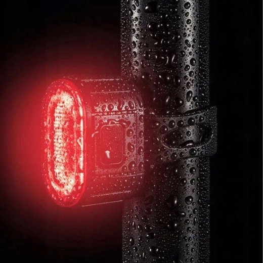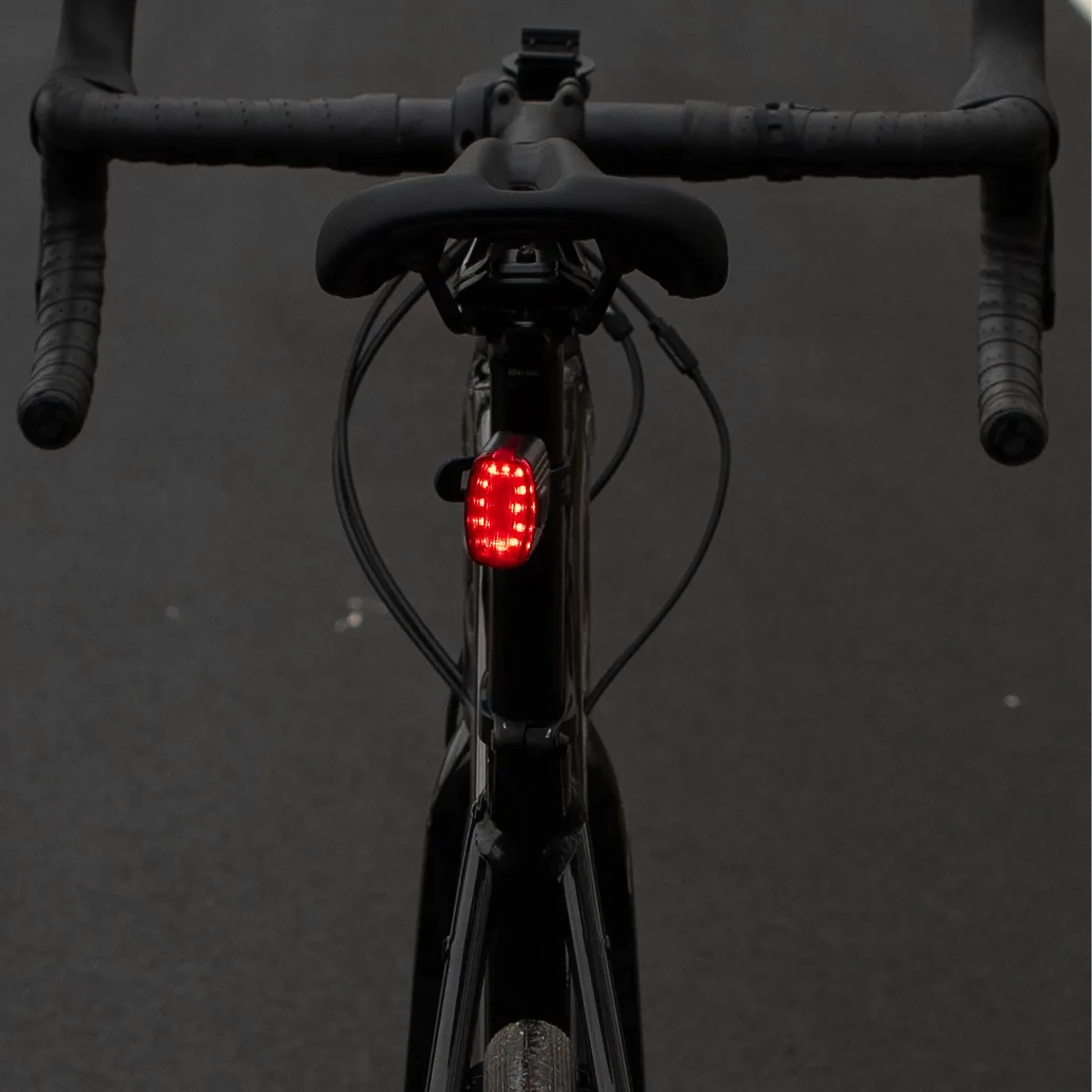Den røde LED-baglygte med flere tilstande gør dig tydeligt synlig for bilister og cyklister bag dig. Nem montering på sadelpinden med elastisk rem.