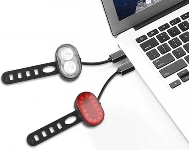 - 1× forlygte, 1× baglygte, USB-kabel/kabler, monteringsremme