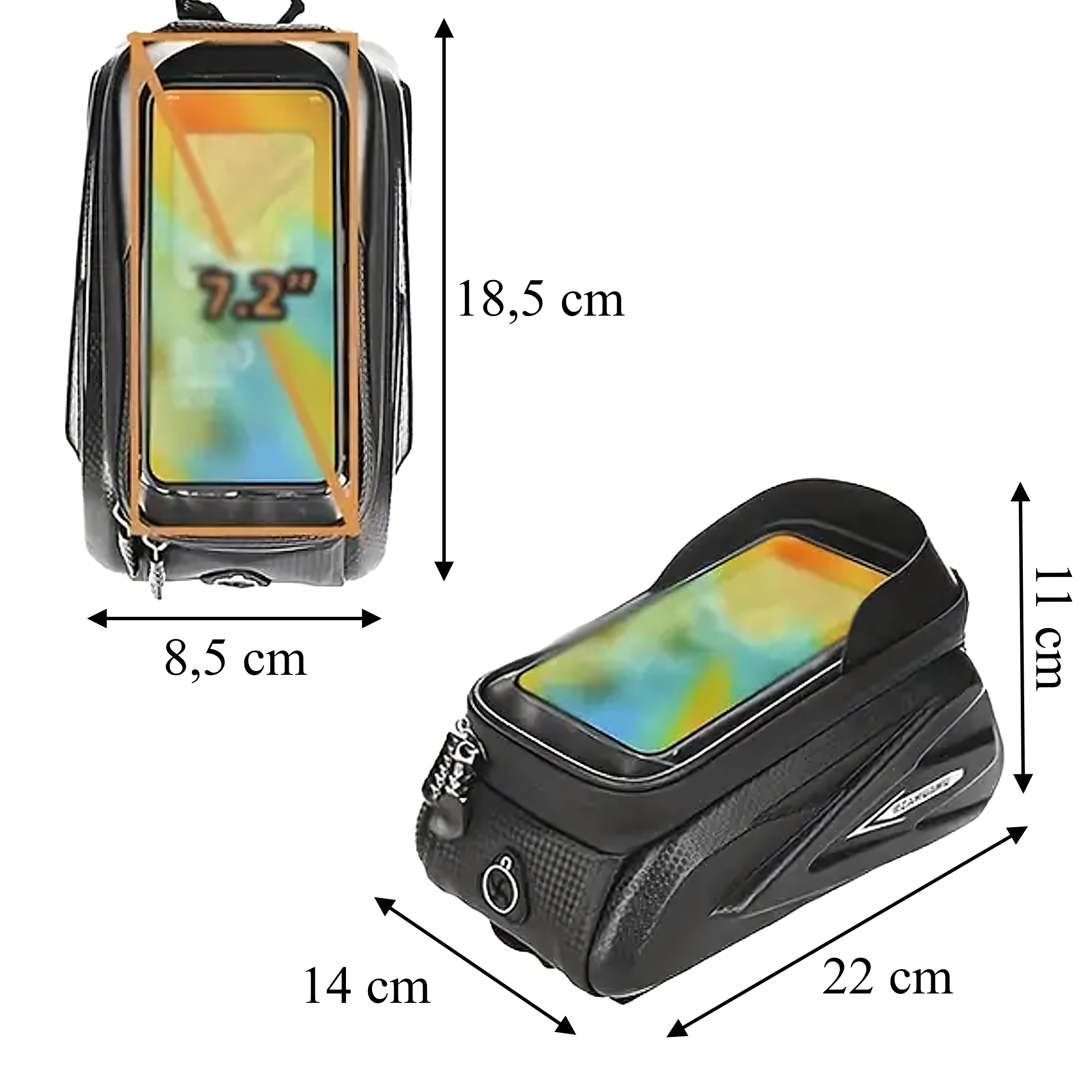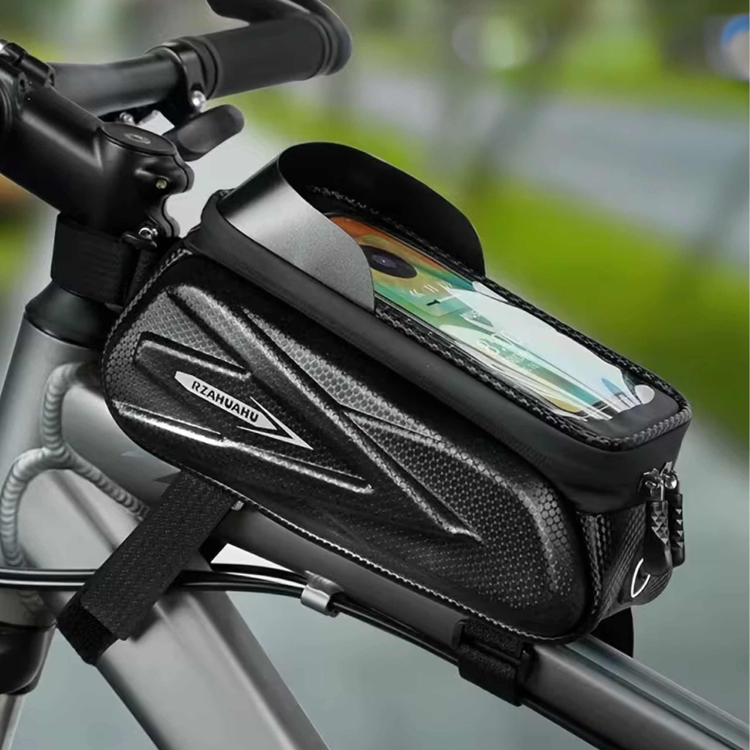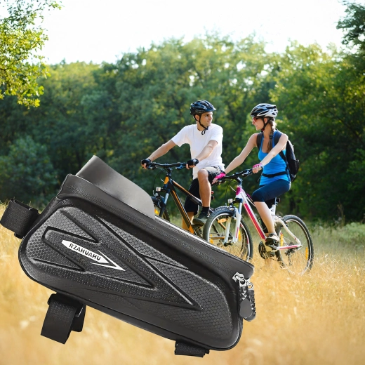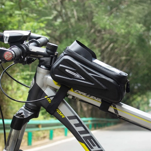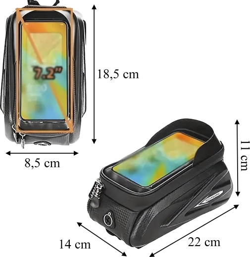 Praktisk cykelrammetaske til den øverste rammestang med gennemsigtigt etui til smartphone muliggør betjening af touchskærmen, byder på vandtætte lynlåse og et robust, halvhårdt kabinet til sikker opbevaring af nøgler, værktøj eller pung. Takket være hurtig montering med velcro sidder den stabilt, og du har altid telefonen ved hånden til navigation og musik.