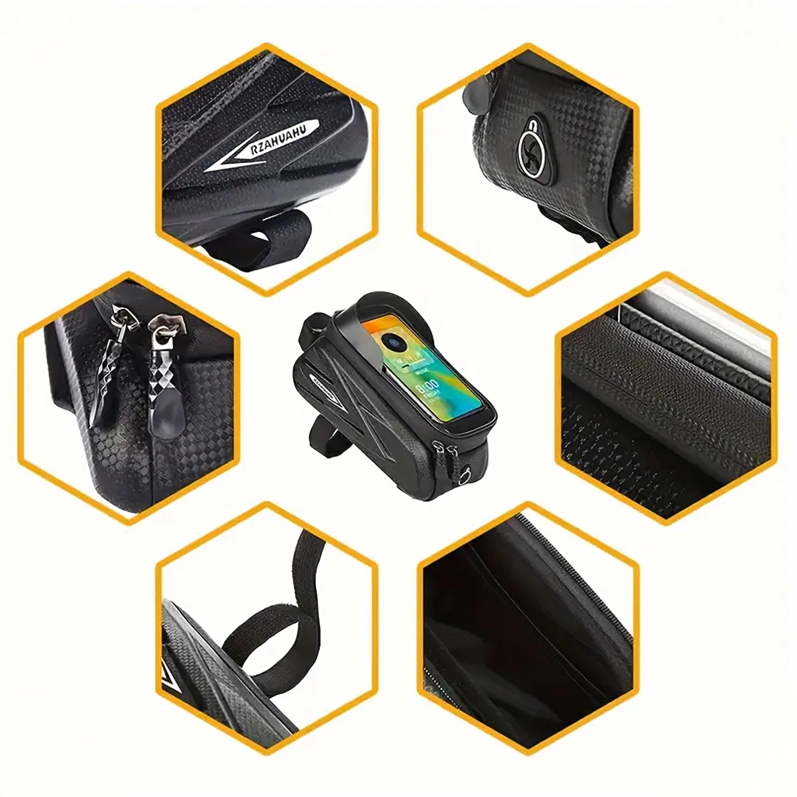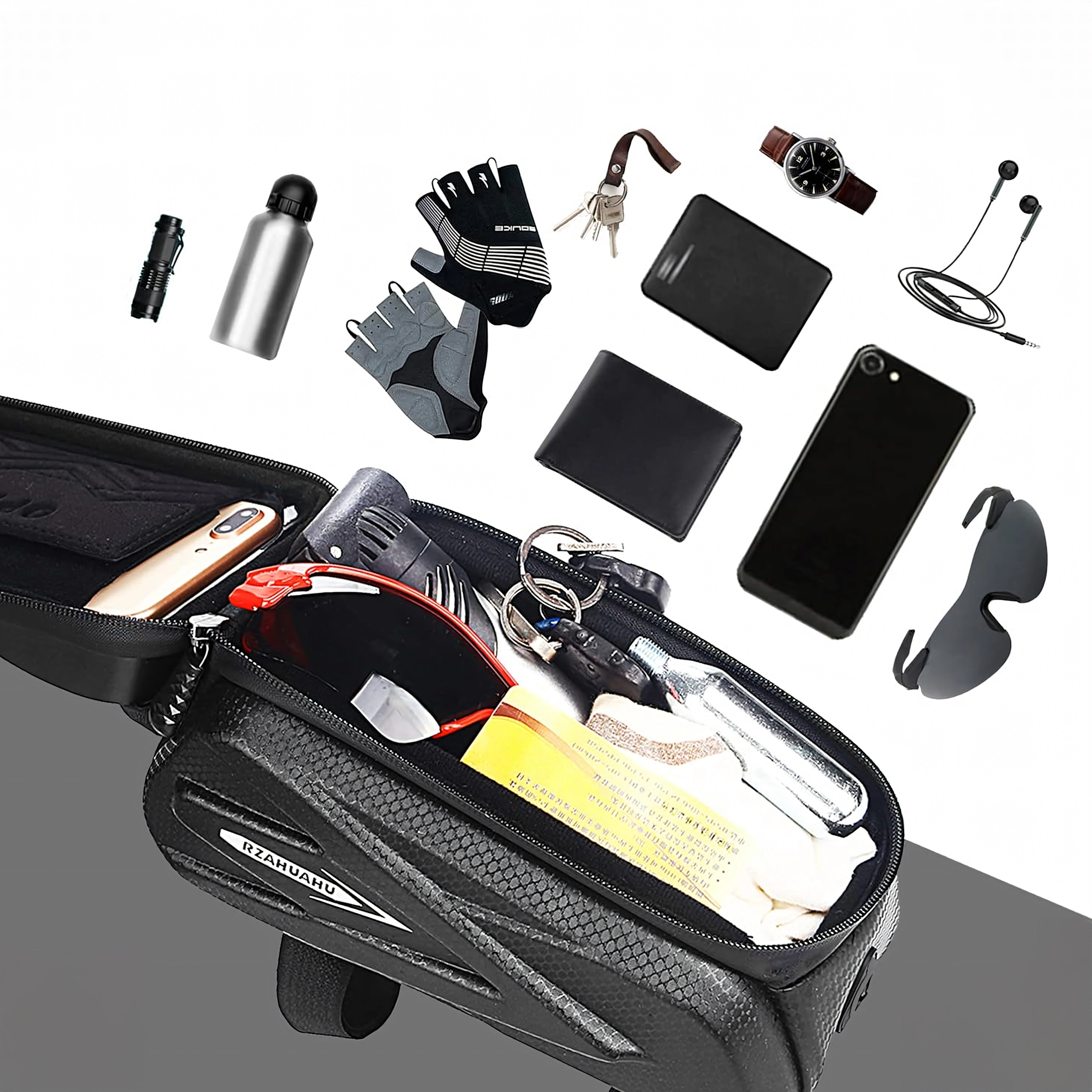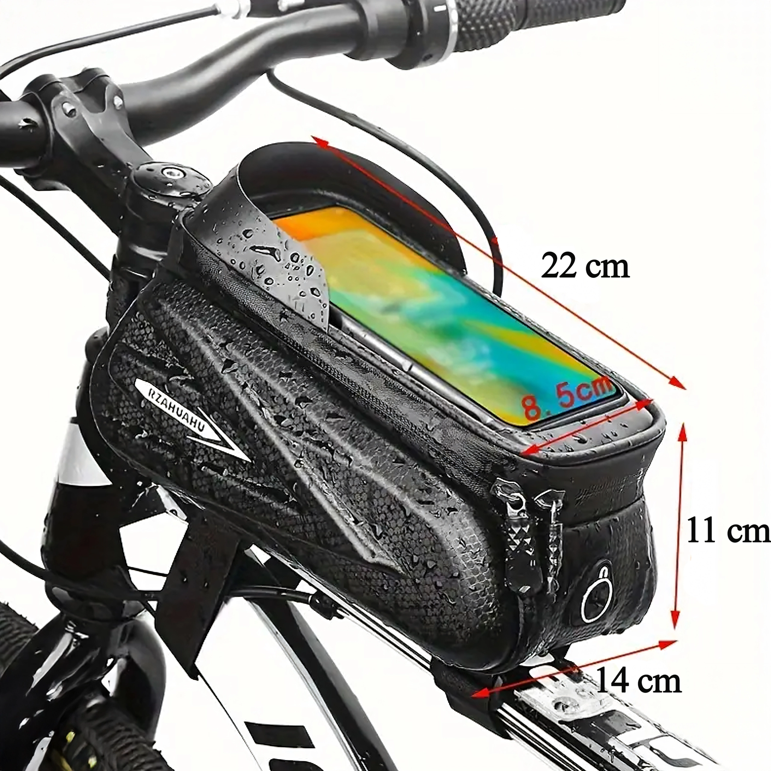 Praktisk cykelrammetaske til den øverste rammestang med gennemsigtigt etui til smartphone muliggør betjening af touchskærmen, byder på vandtætte lynlåse og et robust, halvhårdt kabinet til sikker opbevaring af nøgler, værktøj eller pung. Takket være hurtig montering med velcro sidder den stabilt, og du har altid telefonen ved hånden til navigation og musik.