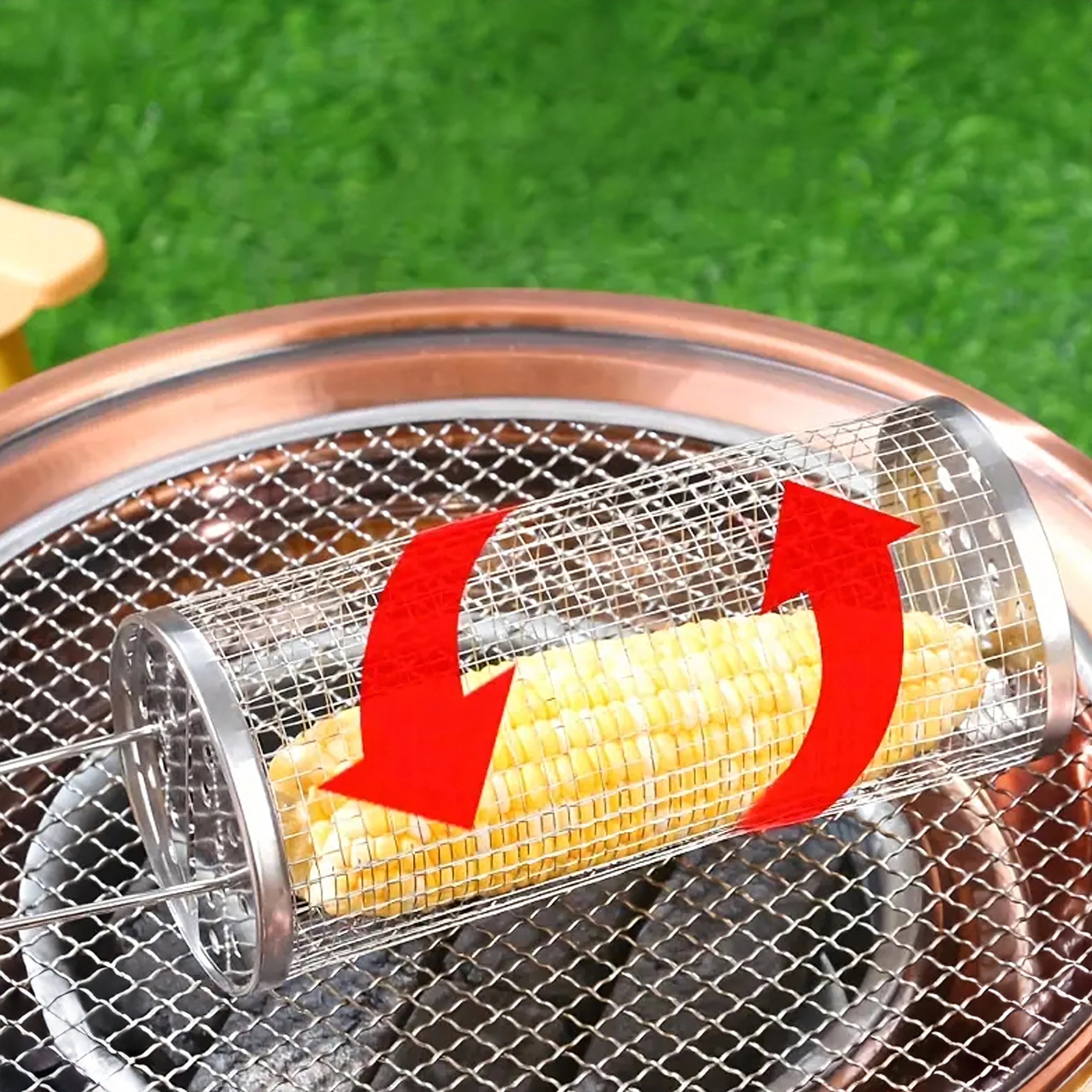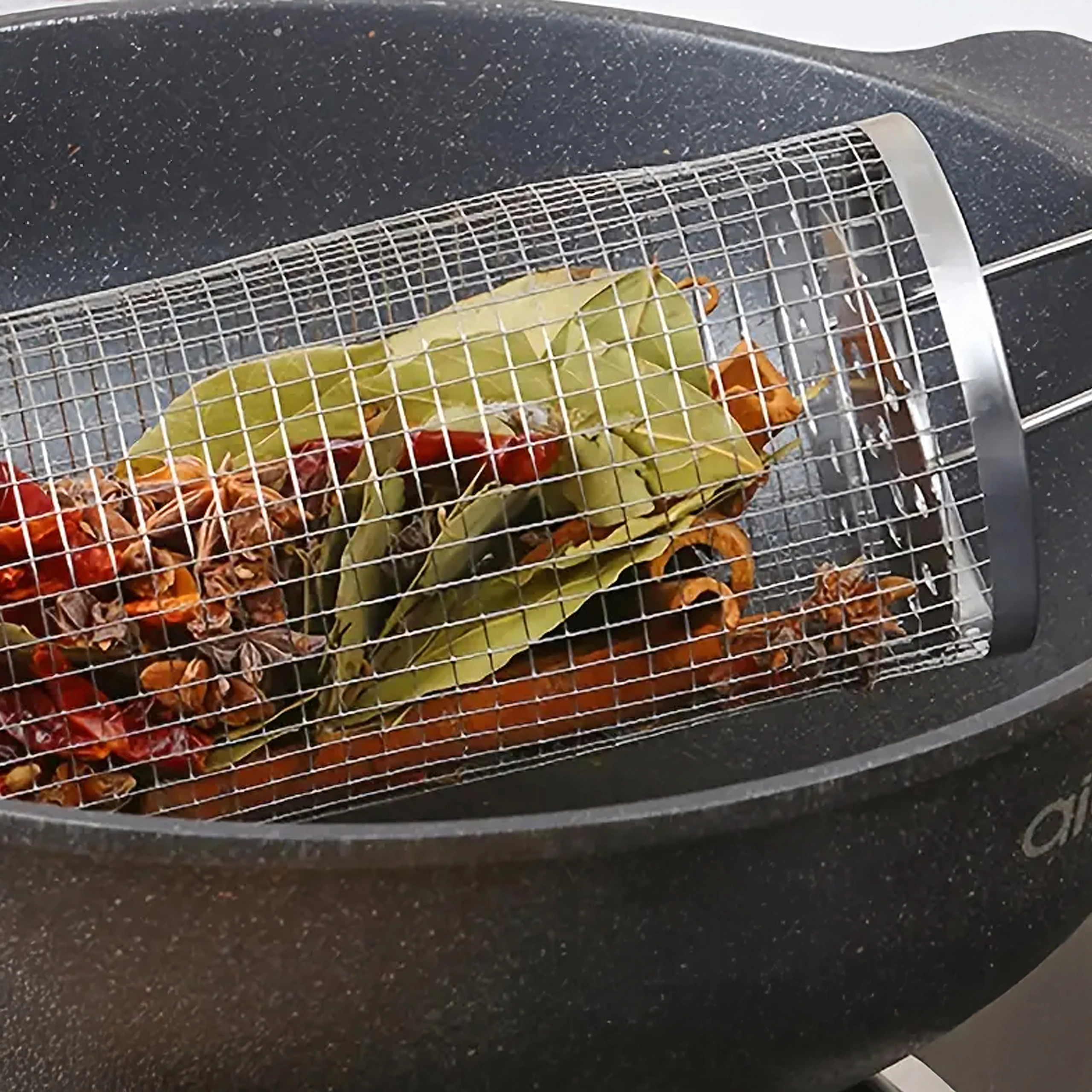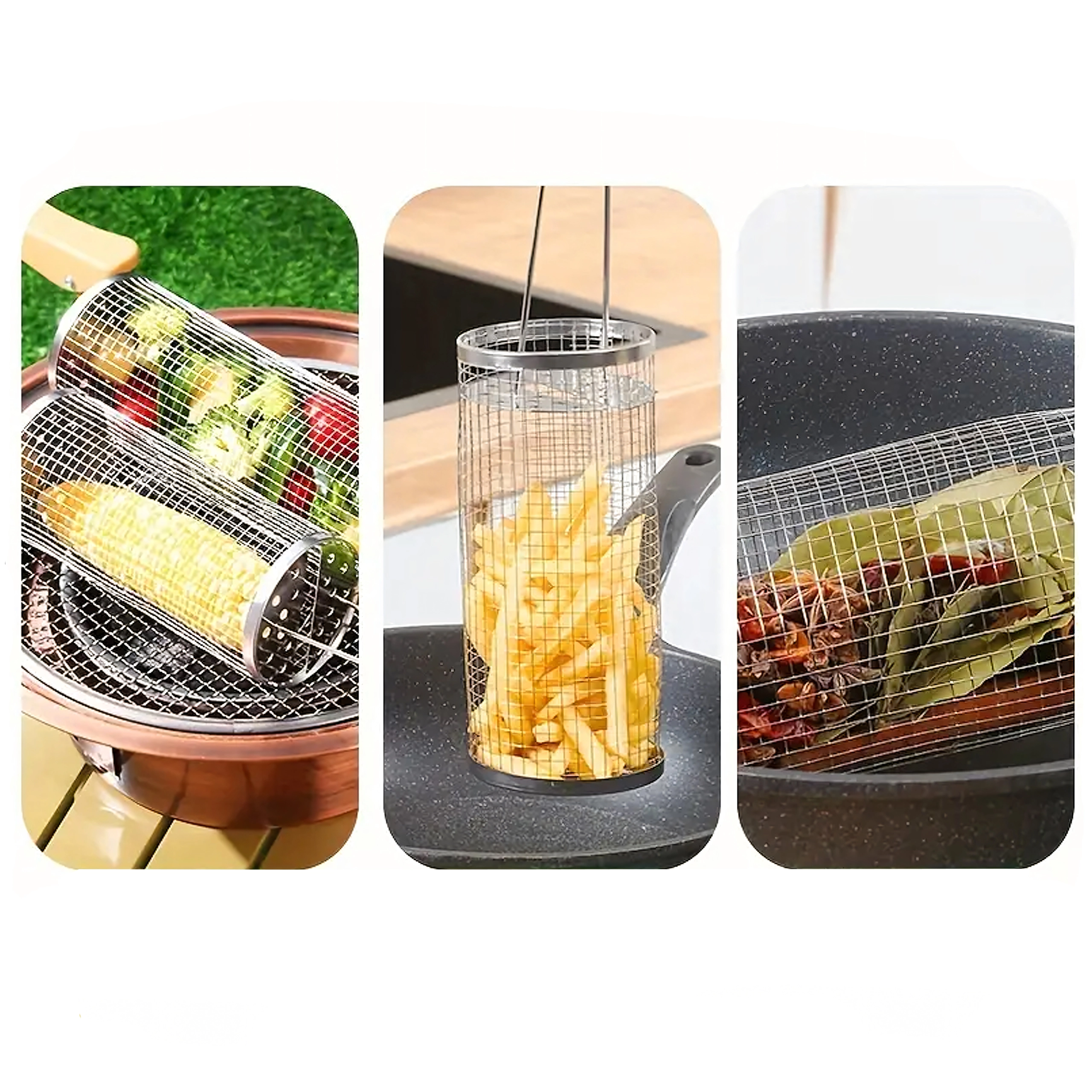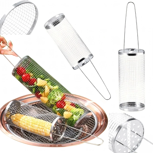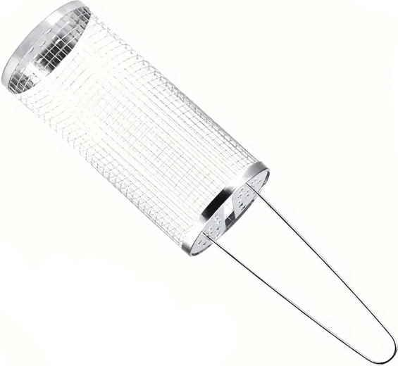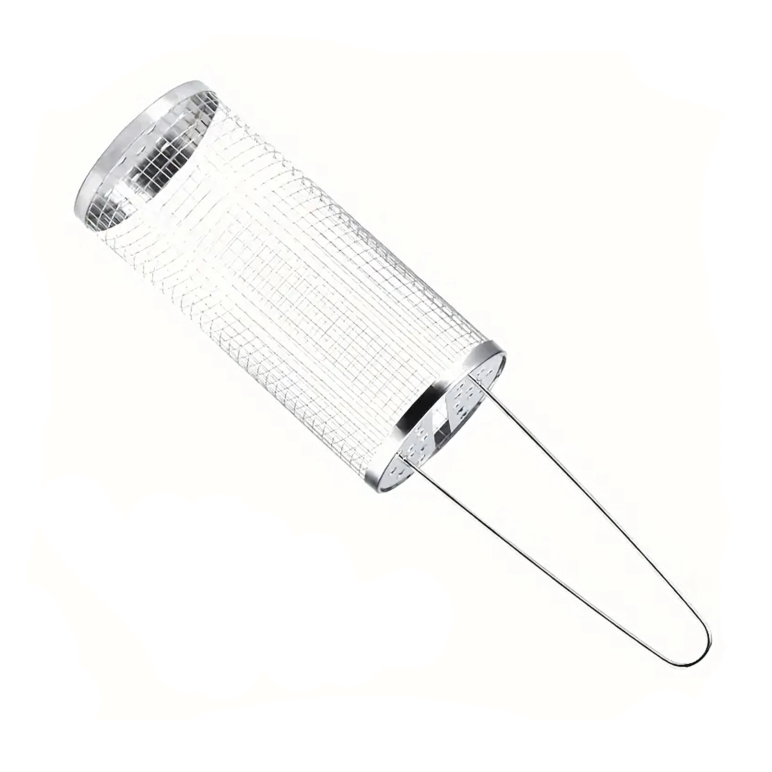 Praktisk roterende grillkurv i holdbart rustfrit stål til nem grillning af små stykker som grøntsager, pommes frites og fisk. Det fine net forhindrer, at maden falder igennem, samtidig med at det muliggør jævn cirkulation af varme og røg for perfekt smag. Takket være det lange trådhåndtag er håndteringen sikker og behagelig, og den cylindriske form muliggør glat rotation for ensartet tilberedning.