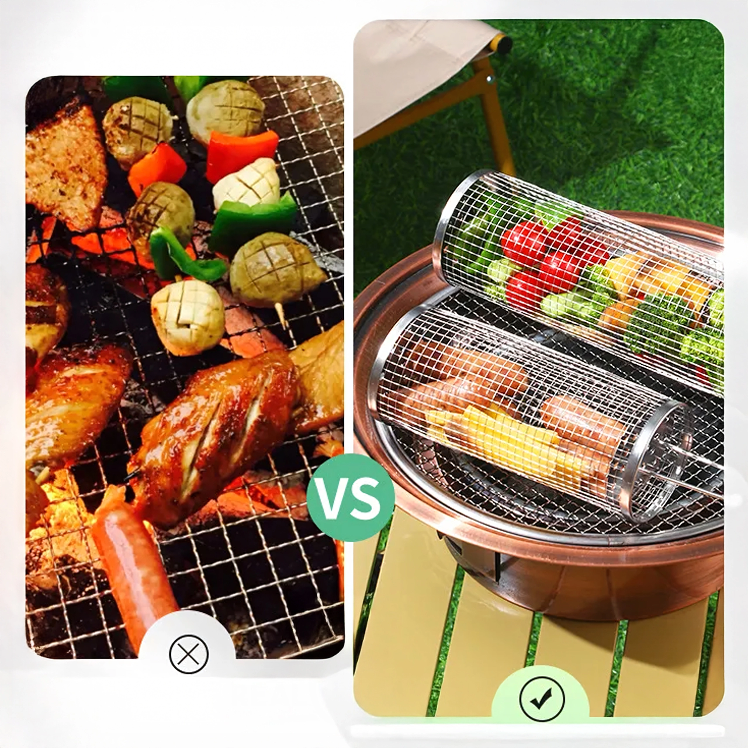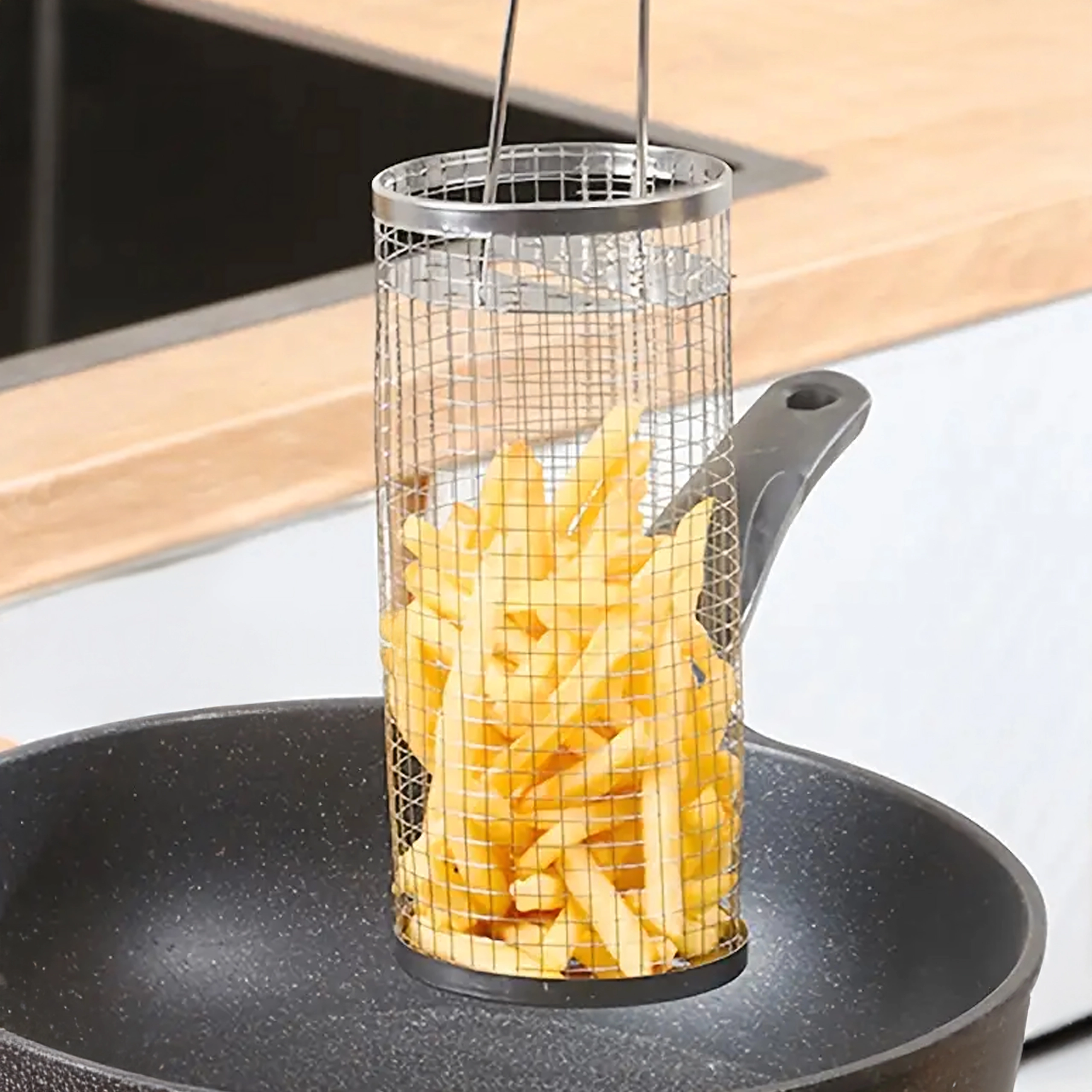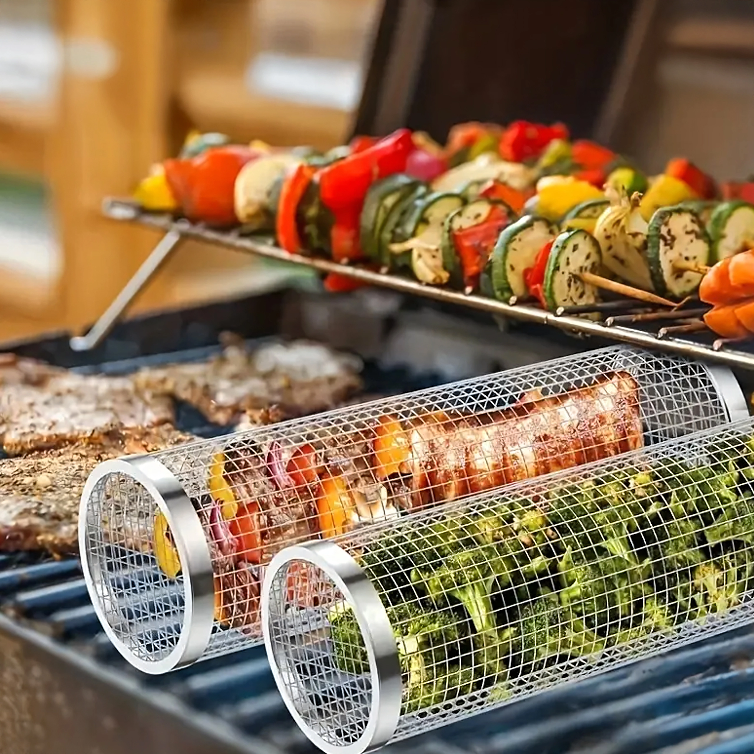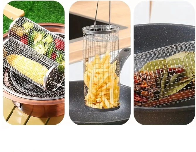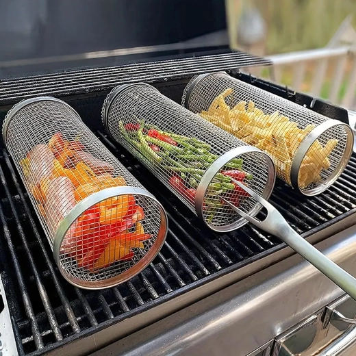 Praktisk roterende grillkurv i holdbart rustfrit stål til nem grillning af små stykker som grøntsager, pommes frites og fisk. Det fine net forhindrer, at maden falder igennem, samtidig med at det muliggør jævn cirkulation af varme og røg for perfekt smag. Takket være det lange trådhåndtag er håndteringen sikker og behagelig, og den cylindriske form muliggør glat rotation for ensartet tilberedning.