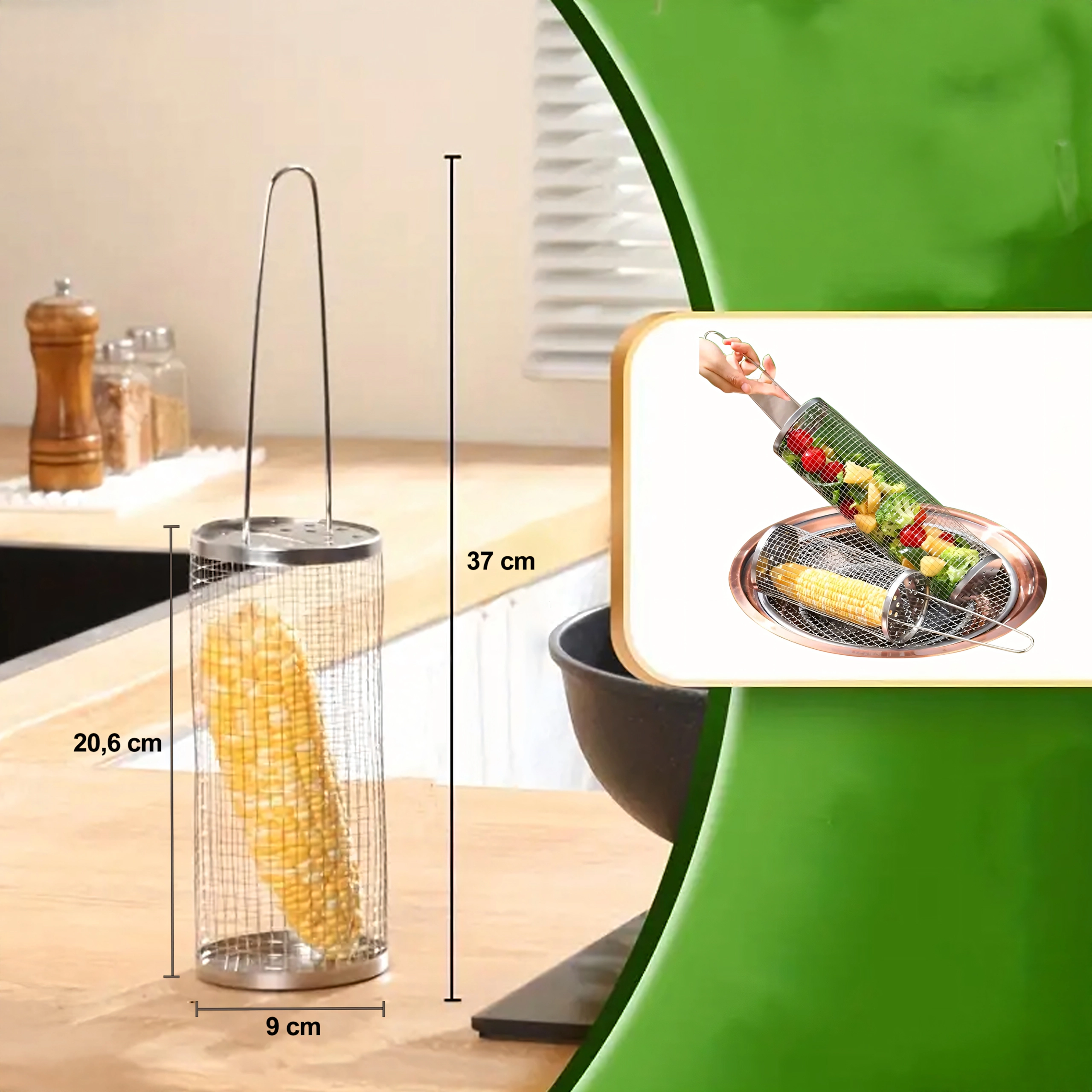 Den cylindriske form med fint net sikrer glat rotation og ensartet tilberedning af grøntsager, kartofler og kød uden risiko for at falde gennem risten.