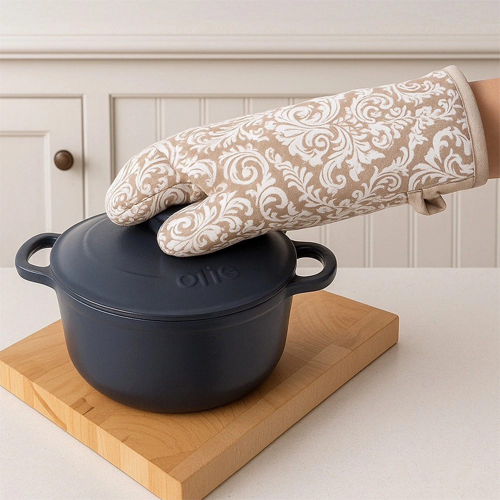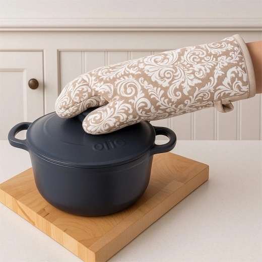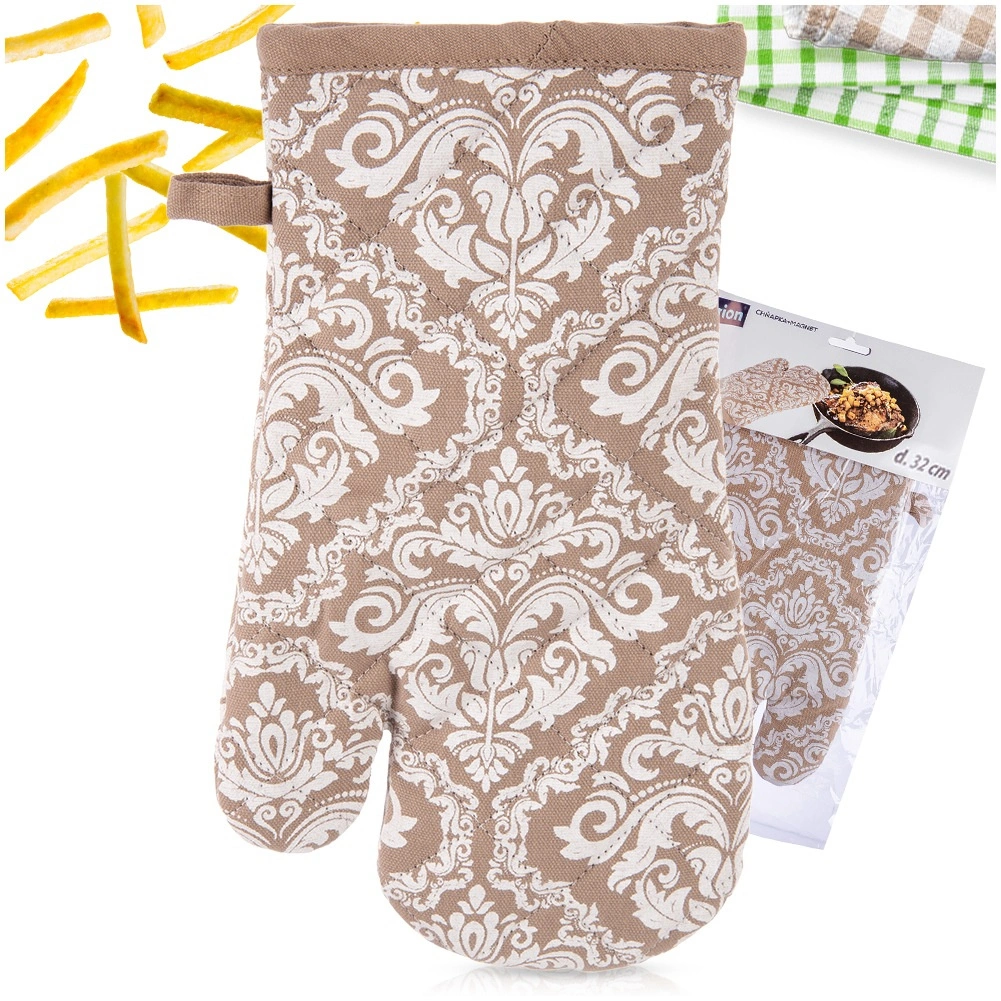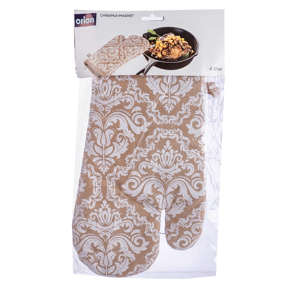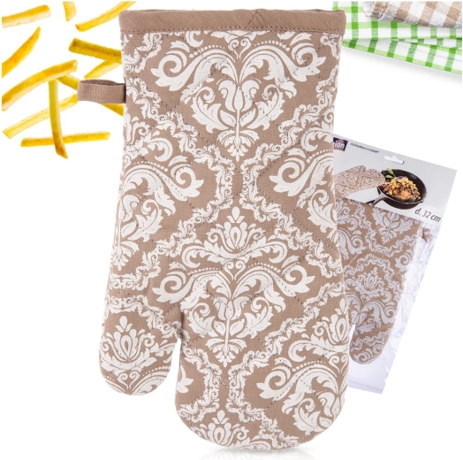 Praktisk køkkenhandske af høj kvalitet i 100% bomuld i elegant beige med hvidt mønster, der giver pålidelig varmebeskyttelse ved madlavning og bagning. Takket være universel størrelse 18 × 32 cm passer den både på højre og venstre hånd, har ophængsstrop og en integreret magnet til nem fastgørelse på metaloverflader. Kan vaskes ved op til 30 °C.