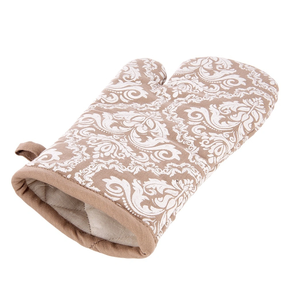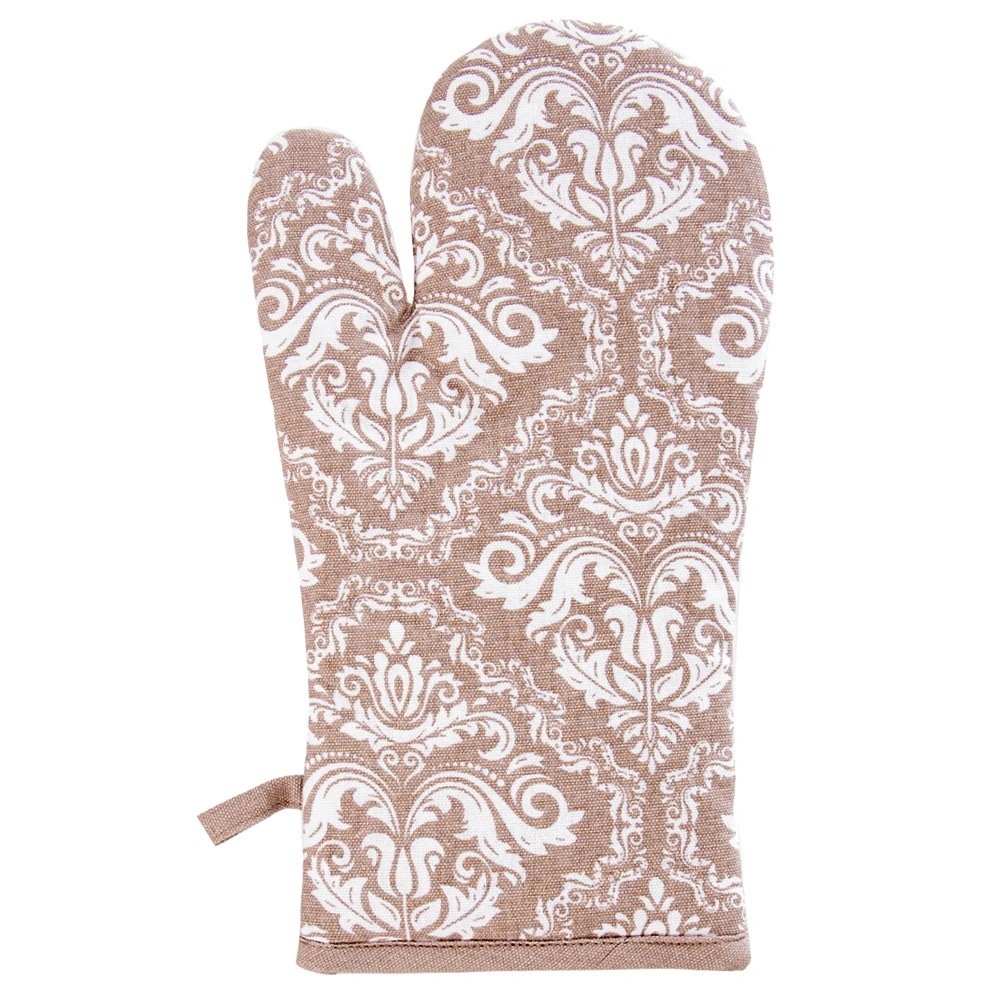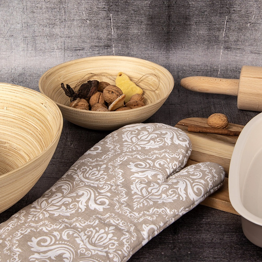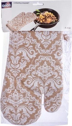 Praktisk køkkenhandske af høj kvalitet i 100% bomuld i elegant beige med hvidt mønster, der giver pålidelig varmebeskyttelse ved madlavning og bagning. Takket være universel størrelse 18 × 32 cm passer den både på højre og venstre hånd, har ophængsstrop og en integreret magnet til nem fastgørelse på metaloverflader. Kan vaskes ved op til 30 °C.