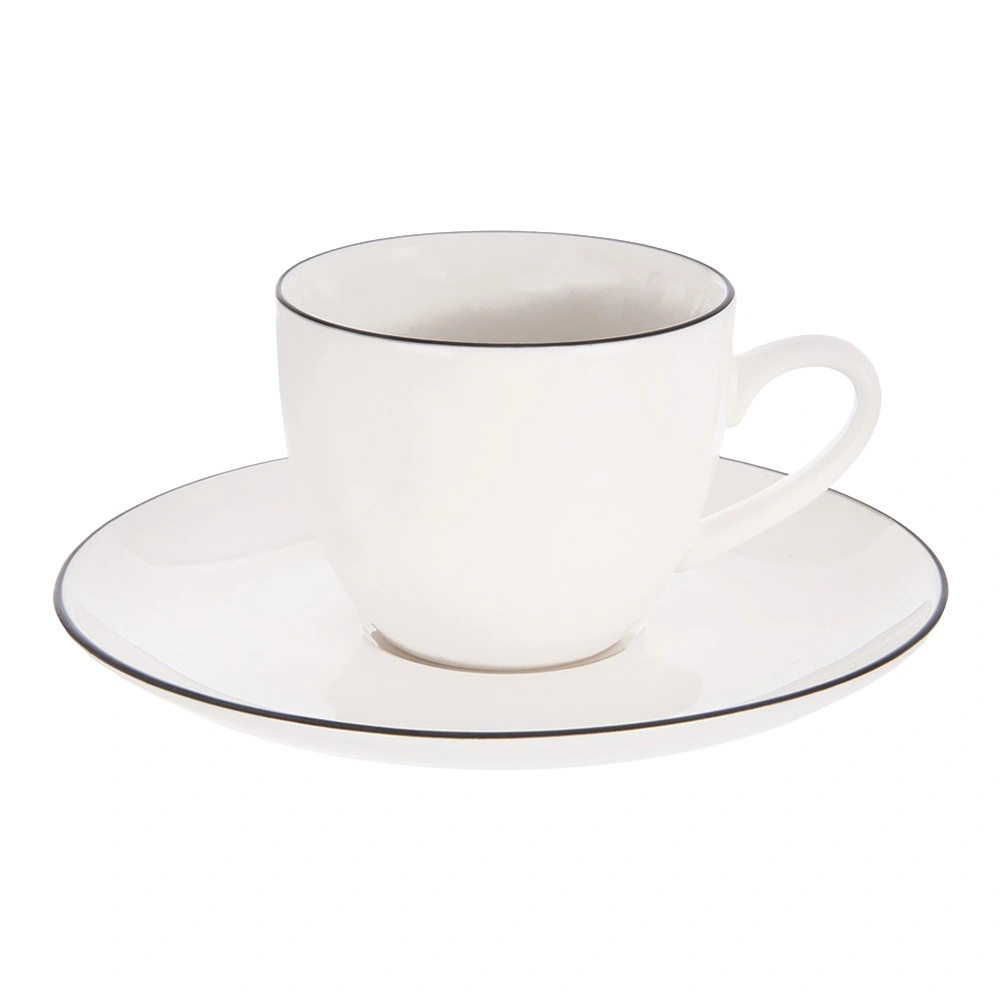 Elegant porcelænsunderkop med en diameter på 13 cm til espresso. Minimalistisk design med en tynd mørk kant, tidløst udseende, egnet til opvaskemaskine og mikroovn, stabil støtte til koppen og alsidig anvendelse til servering af små desserter.