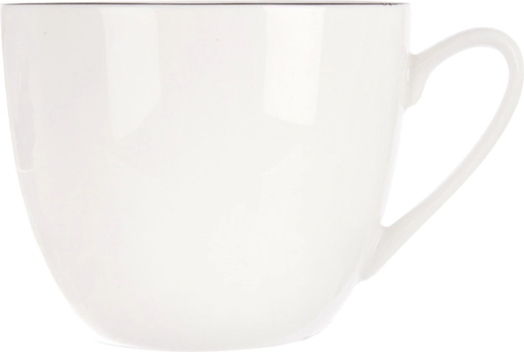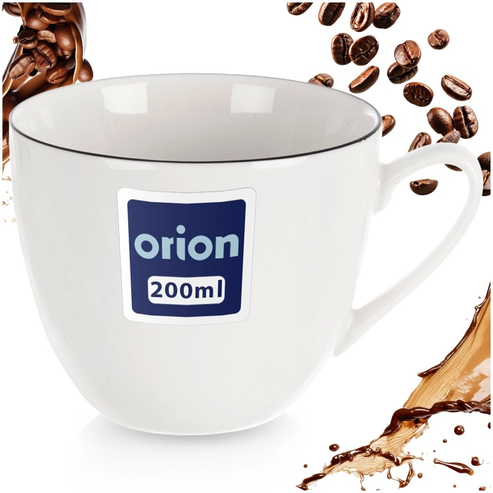 Elegant hvid porcelænskop fra kollektionen DECORA med en kapacitet på 200 ml, ideel til både kaffe og te. Den har en tynd sort kant for et tidløst udtryk, et ergonomisk øre for behageligt greb og er egnet til opvaskemaskine og mikrobølgeovn. Et fremragende valg til daglig brug og stilfuld servering.