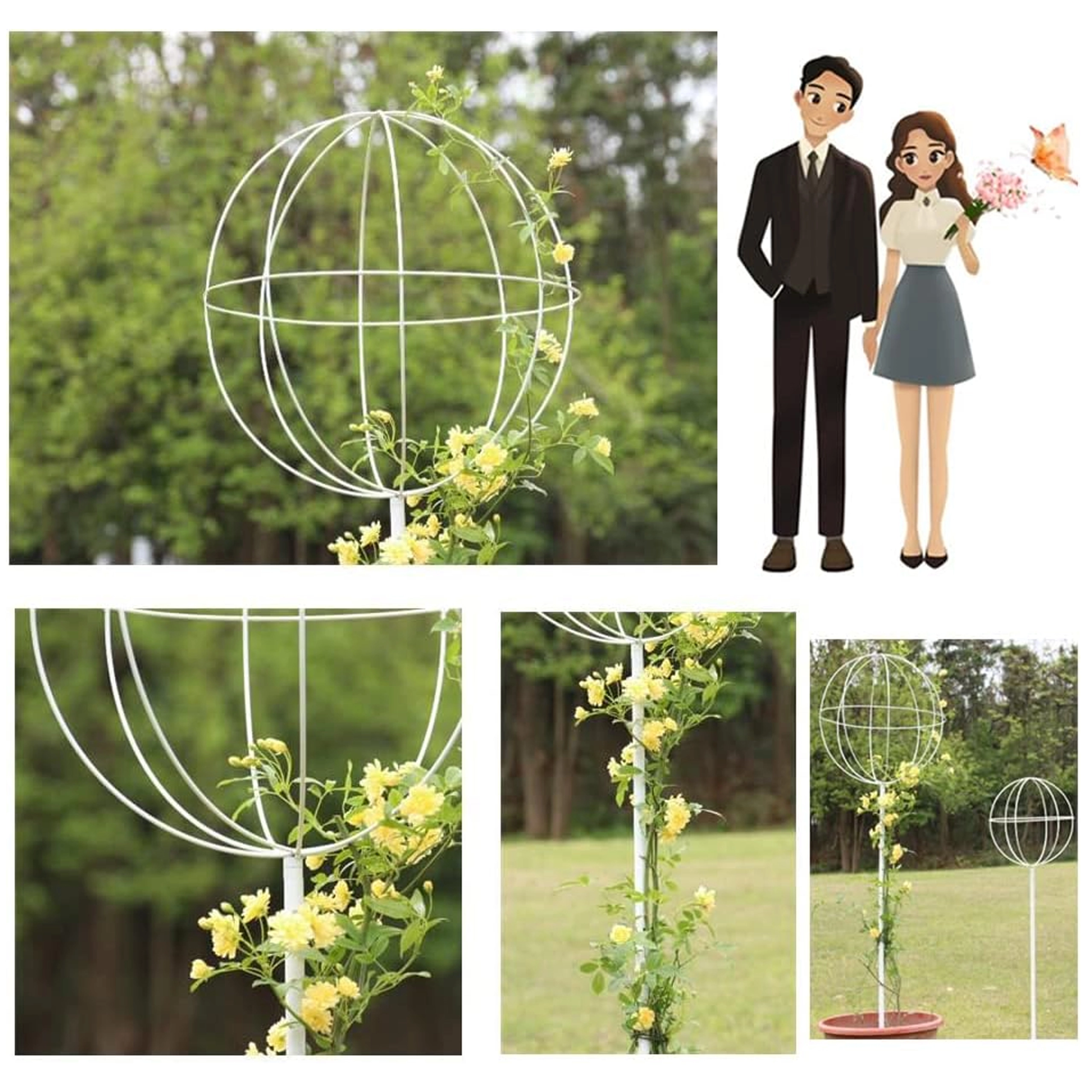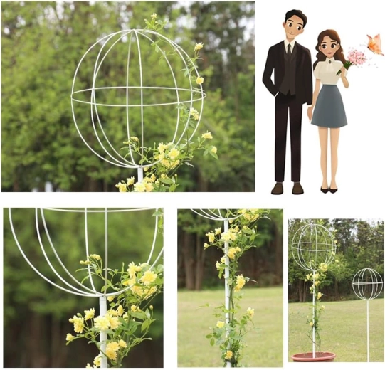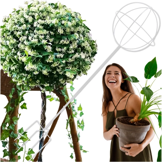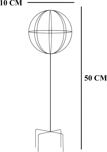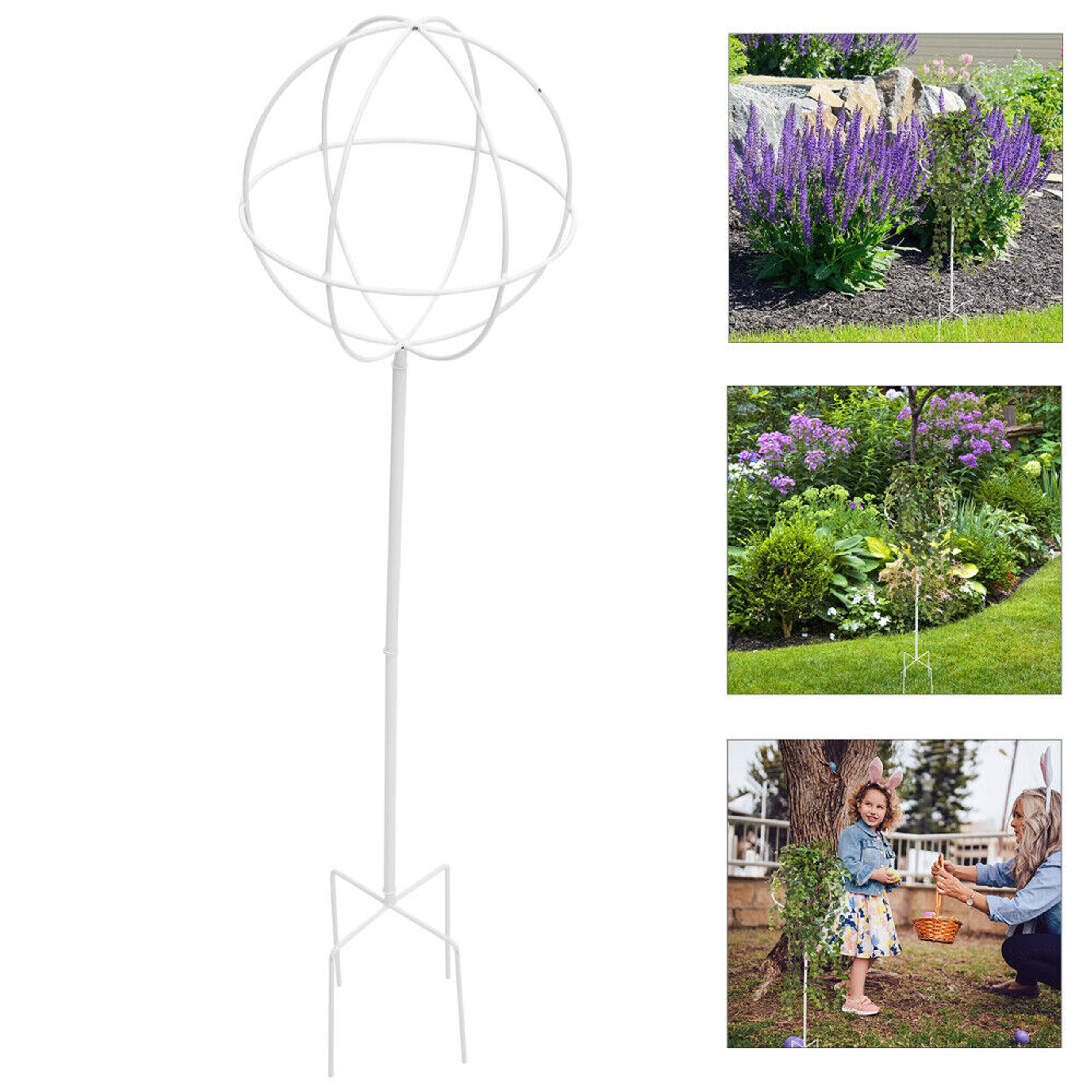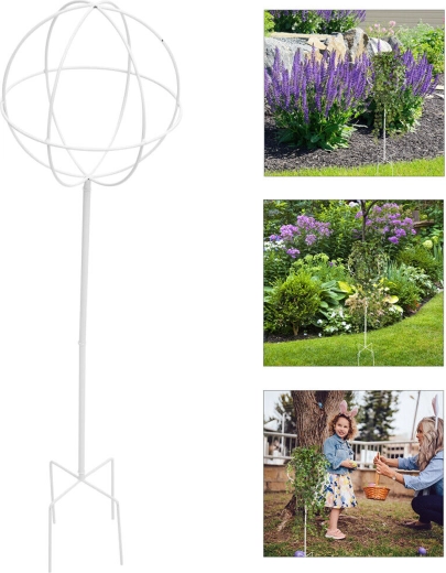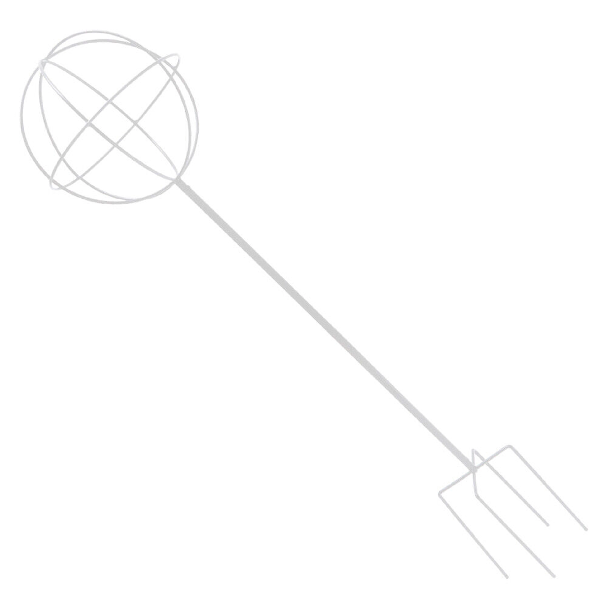 Denne stilrene metalstøtte i kugleform på en stang er ideel til dyrkning af klatreplanter, roser og blomstrende lianer. Den hvide overflade træder smukt frem blandt grønt og blomster, uden at forstyrre beplantningens naturlige udtryk. Stikkes let i jorden og giver straks planterne støtte under væksten.