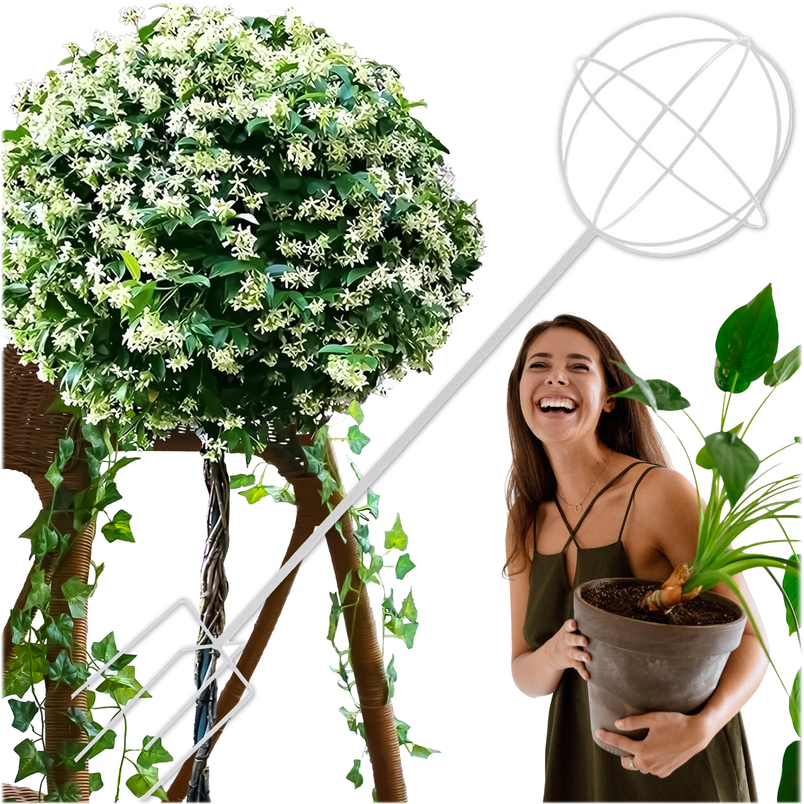 Den lange pæl og den kugleformede kurv leder stænglerne opad, forhindrer brud og fremmer rig blomstring samt god luftcirkulation i beplantningen.