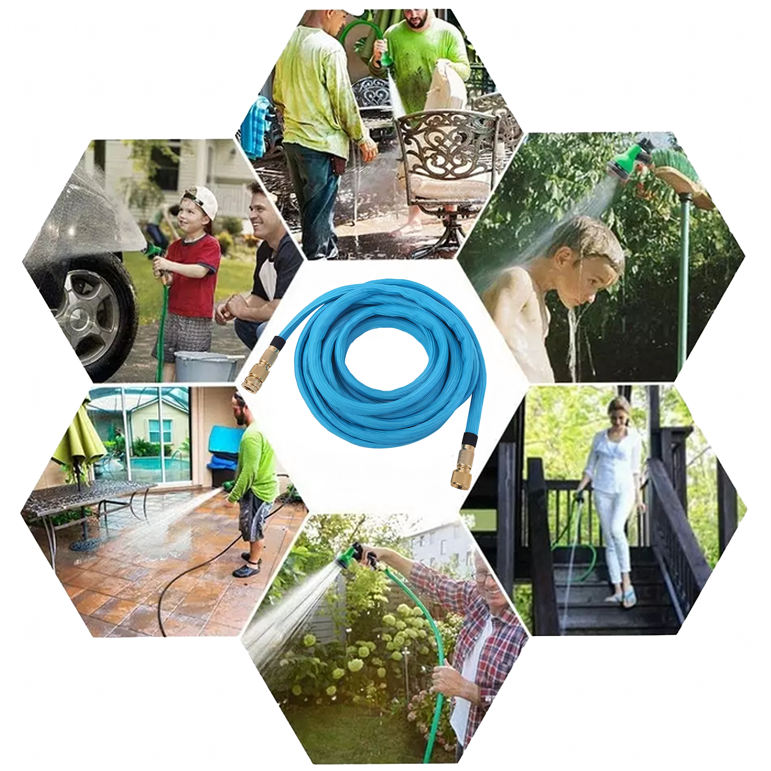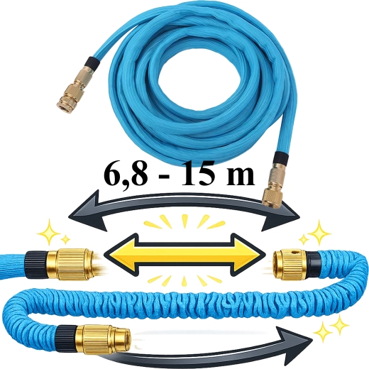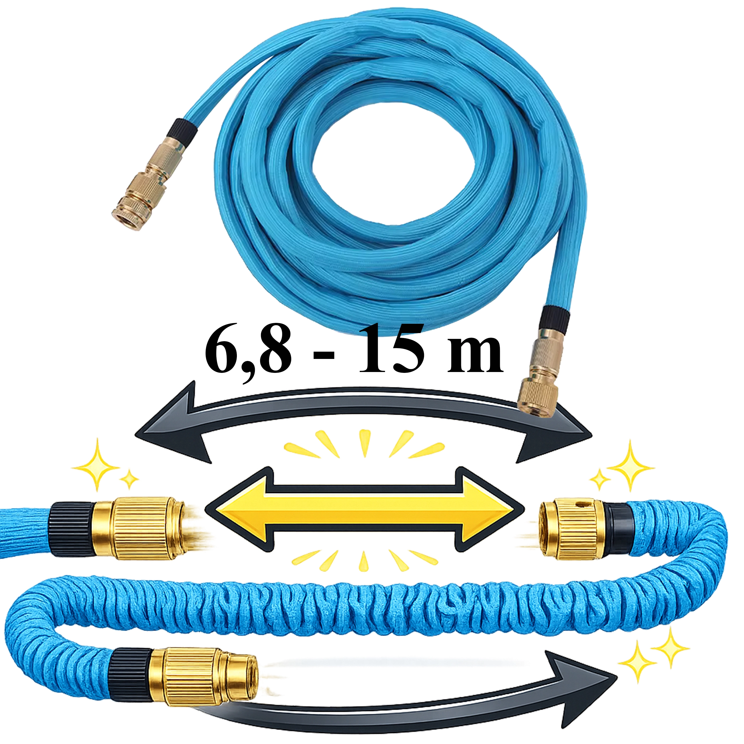 Denne fleksible, udvidelige slange forlænger sin længde op til 15 m ved vandgennemstrømning og trækker sig kompakt sammen efter tømning, så den er let at opbevare på holder, vogn eller hylde. De solide messingkoblinger giver en tæt og holdbar forbindelse til haner og sprøjter.