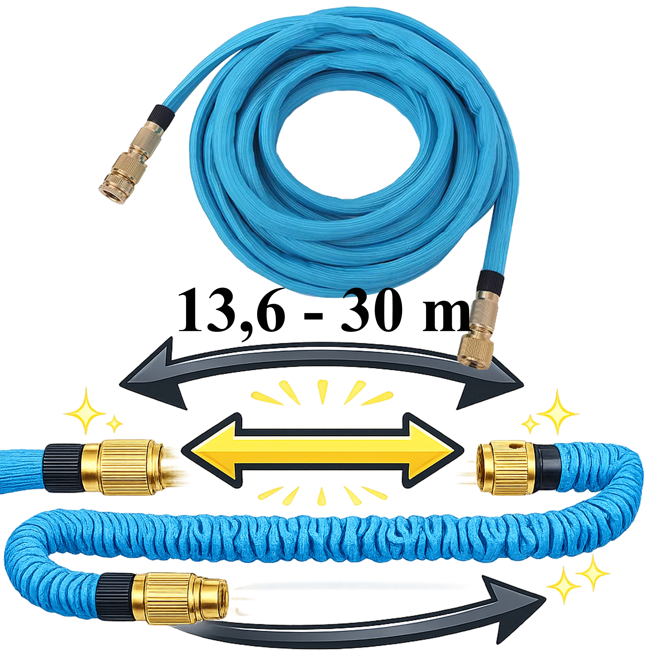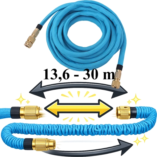 Slangen forlænger sig fra 13,6 m op til 30 m ved vandtryk og trækker sig selv sammen efter brug. Let at bære og opbevare uden rod.