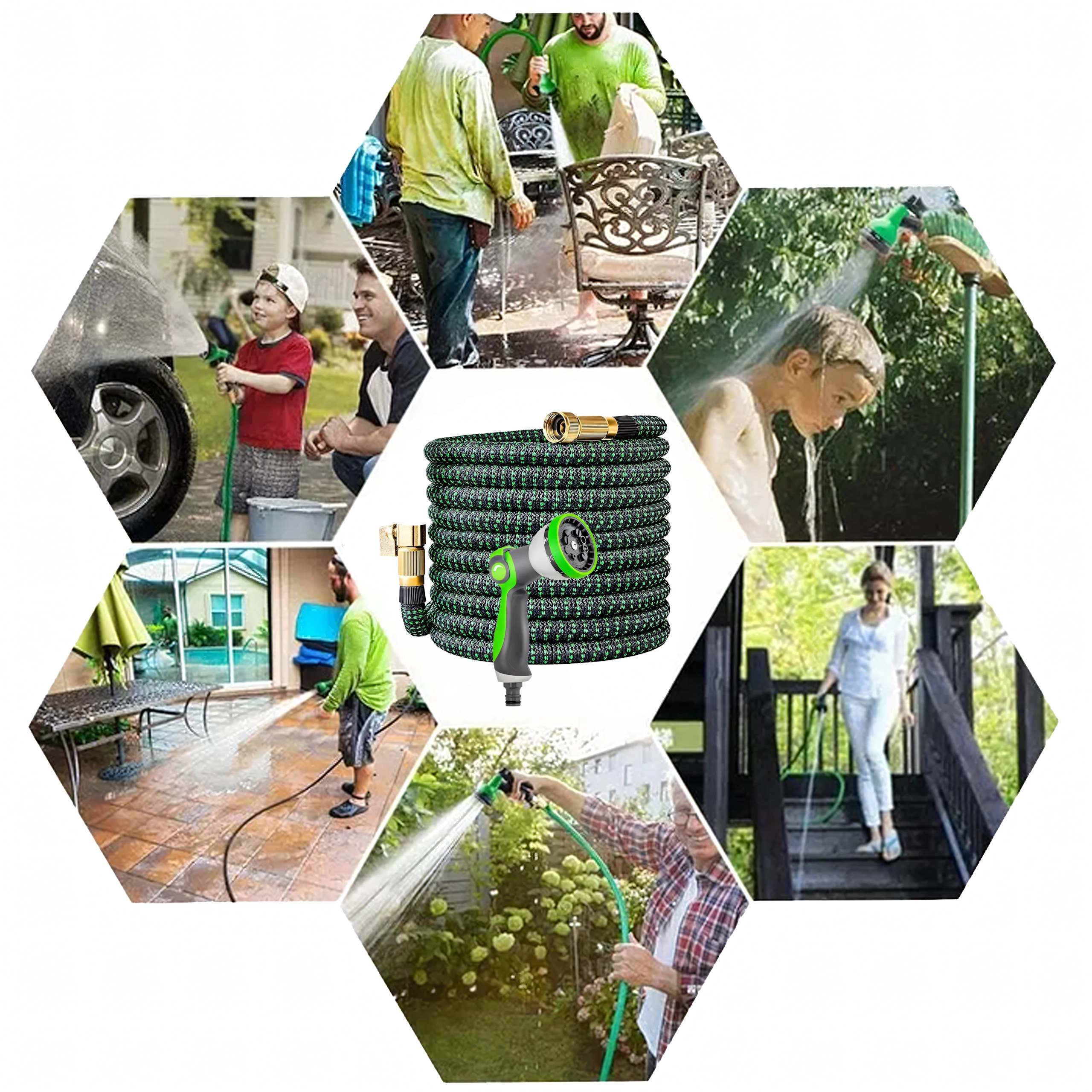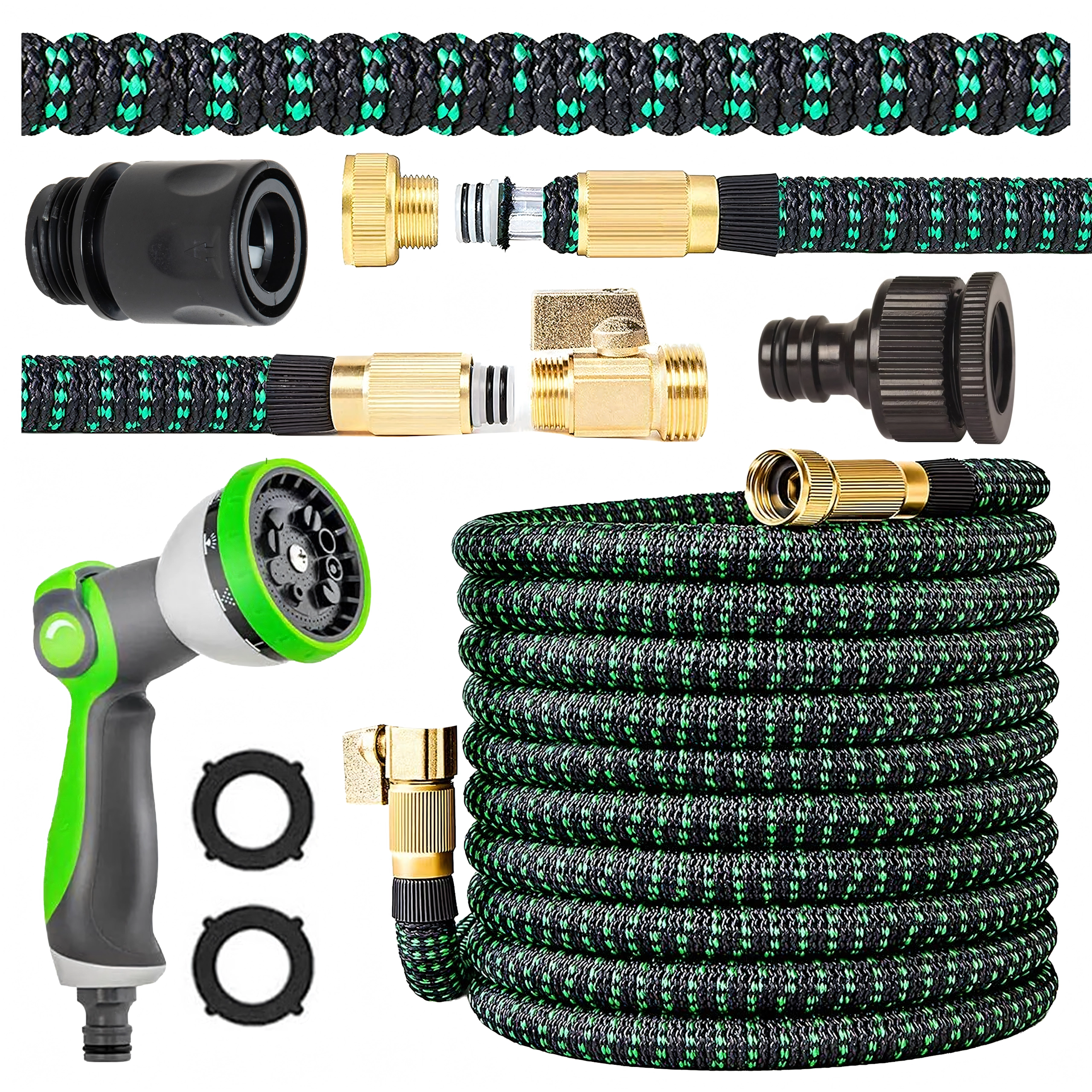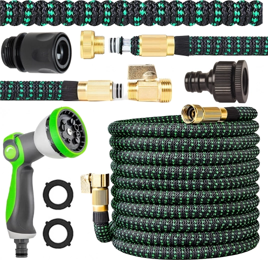 Denne udvidelige slange forlænger sig op til 7,5 m ved vandpåfyldning og trækker sig kompakt sammen igen ved tømning for nem opbevaring. Det tekstile flet kombineret med messing-hurtigkoblinger sikrer holdbarhed, tæthed og lang levetid. Den ergonomiske sprøjtepistol tilbyder flere indstillinger fra fin tåge til kraftig stråle.