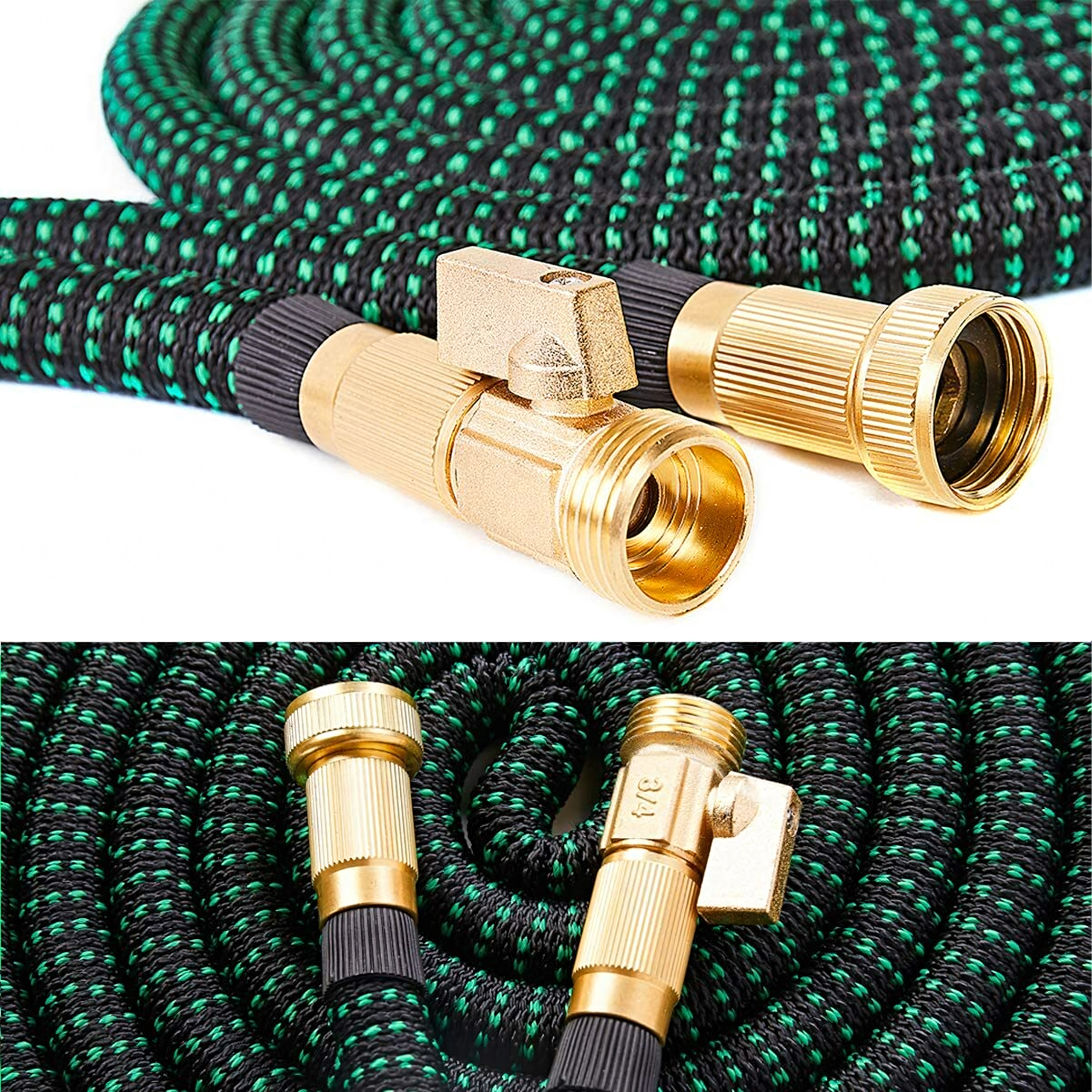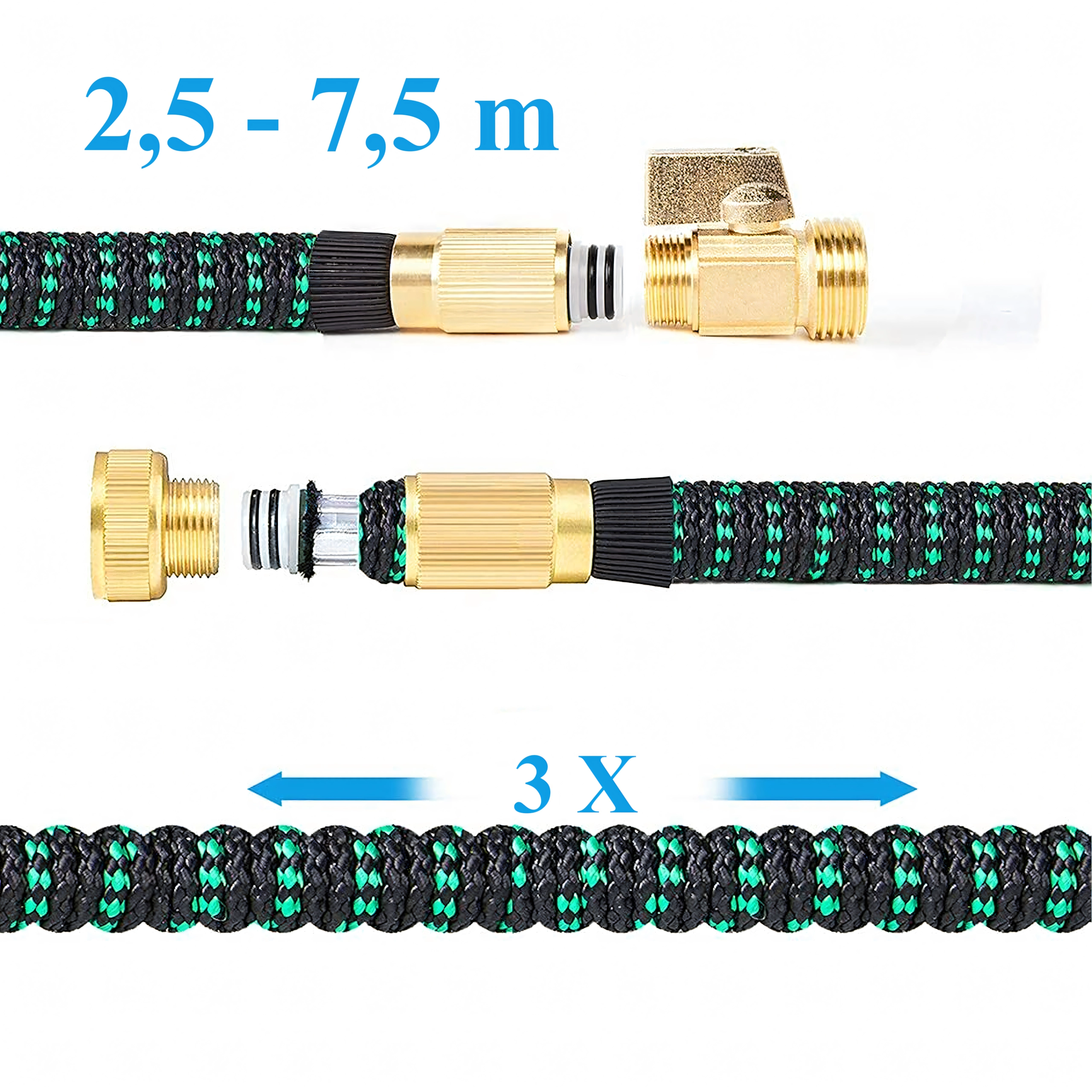 Kompakt og let udvidelig haveslange 2,5–7,5 m med messingkoblinger 1/2" og 3/4" og multifunktionel sprøjtepistol. Slidstærkt tekstilovertræk, beskyttelse mod knæk og afspærringsventil for bekvem vanding af haven, bilvask og rengøring omkring huset.