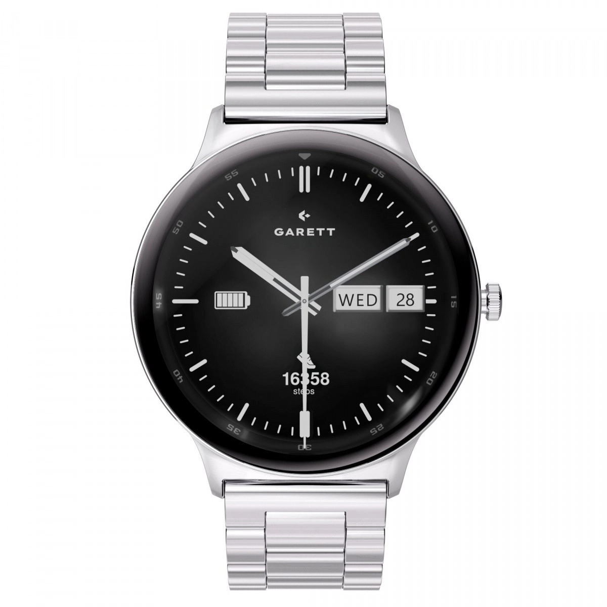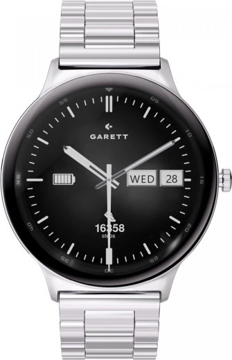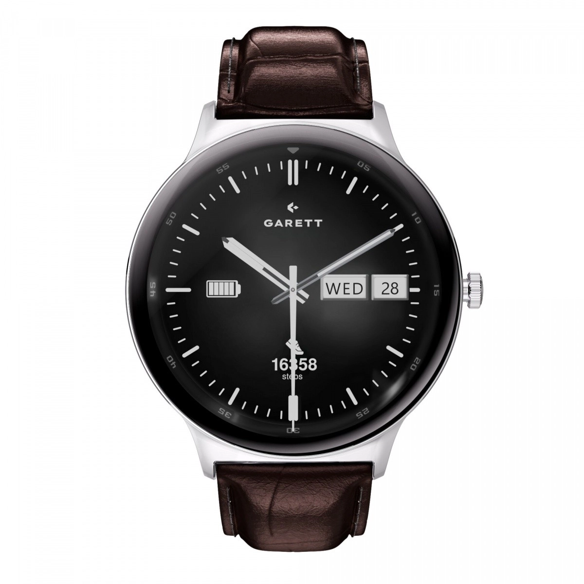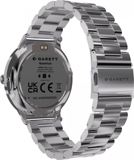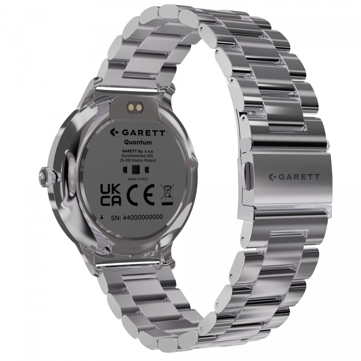 GARETT Quantum er et stilfuldt og robust smartwatch til hverdagsbrug. Den ultratynde krop (ca. 7,5 mm) er behagelig at bære, 1,43" AMOLED-panelet giver fremragende kontrast og læsbarhed, og Always On Display holder tiden synlig hele tiden. Gorilla Glass beskytter skærmen mod ridser, og den roterende krone sikrer hurtig betjening.