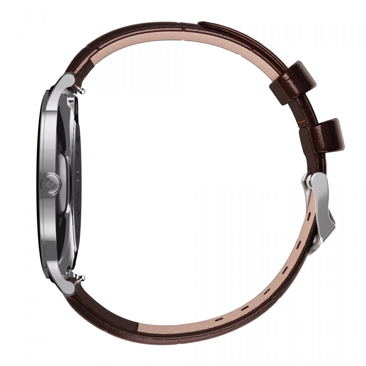 Sølvfarvet rustfrit stålarmbånd for elegance og brun læderrem for komfort. Et værktøj til nem afkortning af armbåndet medfølger.