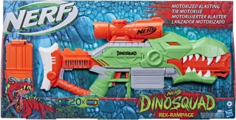 Gør dig klar til uforglemmelige eventyr med mægtige dinosaurer. Nerf DinoSquad Rex-Rampage kombinerer et T-Rex-inspireret design med høj skudkapacitet. Takket være det motoriserede system og et magasin til 10 darts kan du hurtigt og præcist ramme dine mål.