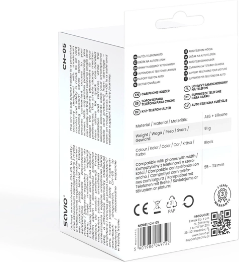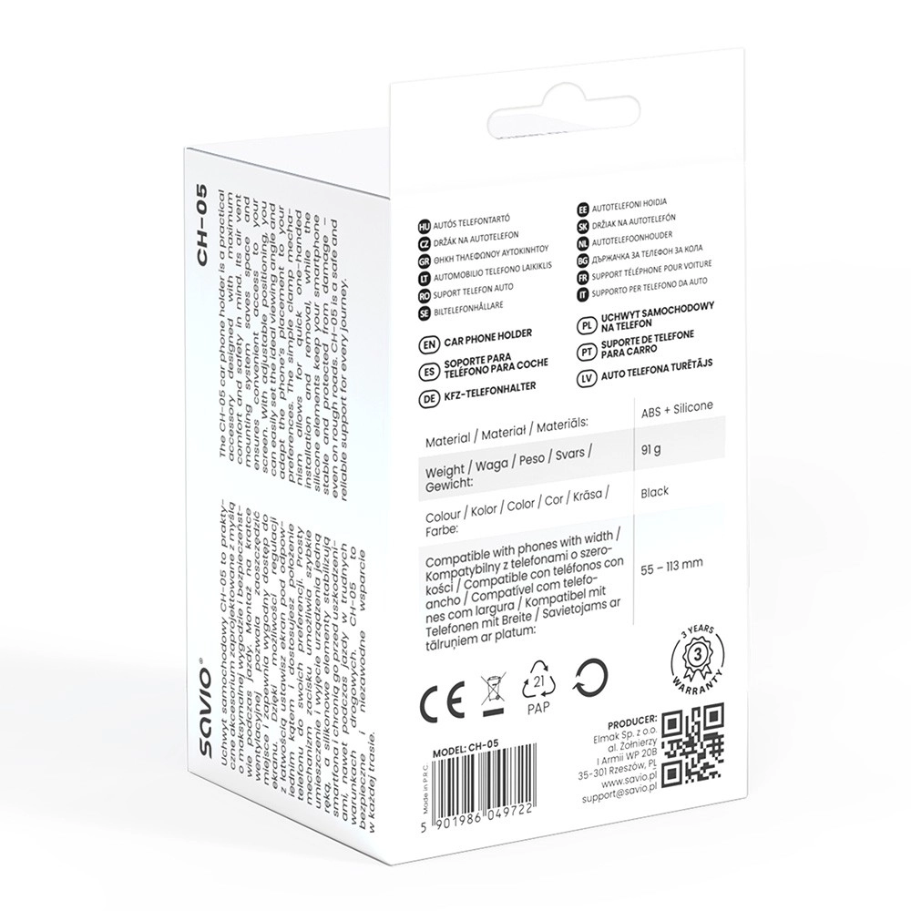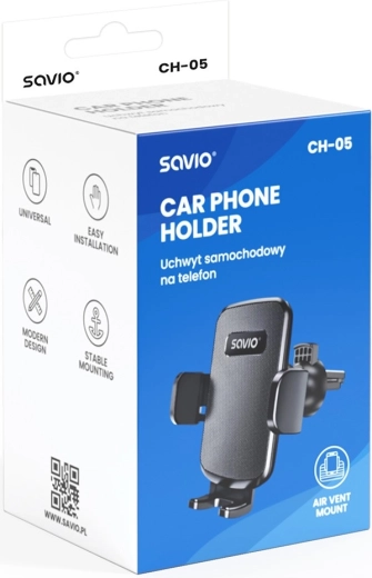 SAVIO CH-05 er en kompakt og elegant telefonholder til bilen, som fastgøres i ventilationsgitteret. Takket være den smarte clip forstyrrer den ikke udsynet og bevarer et rent udtryk på instrumentbrættet. Det drejelige hoved gør det muligt at indstille den ideelle betragtningsvinkel til navigation og opkald.