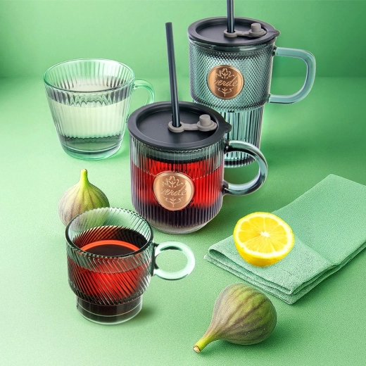 Den elegante VERDE-kop i transparent grønt glas kombinerer et moderne udtryk med praktisk anvendelighed. Den rillede overflade forbedrer grebet, den tykkere bund øger stabiliteten, og de rene linjer passer ind i ethvert køkken.