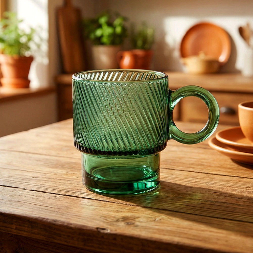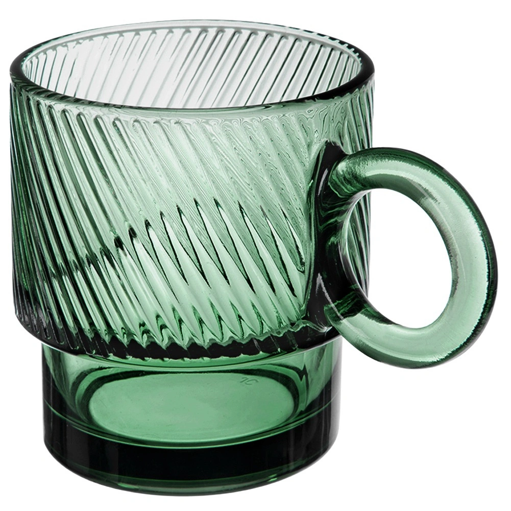 Stilfuld grøn kop af robust glas med kapacitet på 300 ml til daglig nydelse af kaffe, te og kolde drikke. Den teksturerede rillede overflade giver elegance og et sikkert greb, det komfortable øre gør den nem at håndtere, og koppen tåler opvaskemaskine. Ideel til både hjemmet samt caféer og restauranter.