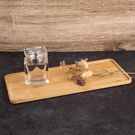 Elegant bambusbakke i rektangulær form med mål 35 × 15 × 1 cm, ideel til servering af desserter, oste, frugt og snacks samt som en stilfuld dekorativ underlag. Naturlig bambus er modstandsdygtig over for fugt, tørrer hurtigt og absorberer ikke lugte. Et fremragende valg til hjemmet og gastronomi.