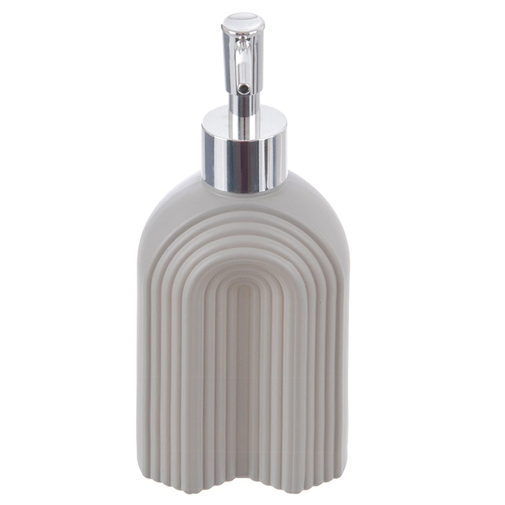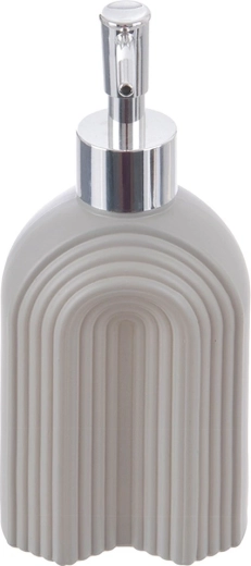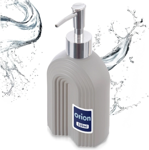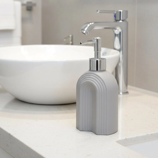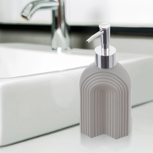 En praktisk og æstetisk hjælper til daglig hygiejne og rengøring. Den grå rillede tekstur i glaskroppen giver rummet et moderne præg og hjælper med at holde orden på håndvasken eller køkkenbordet. Den krom-look pumpe sikrer jævn og kontrolleret dosering.