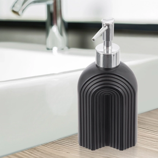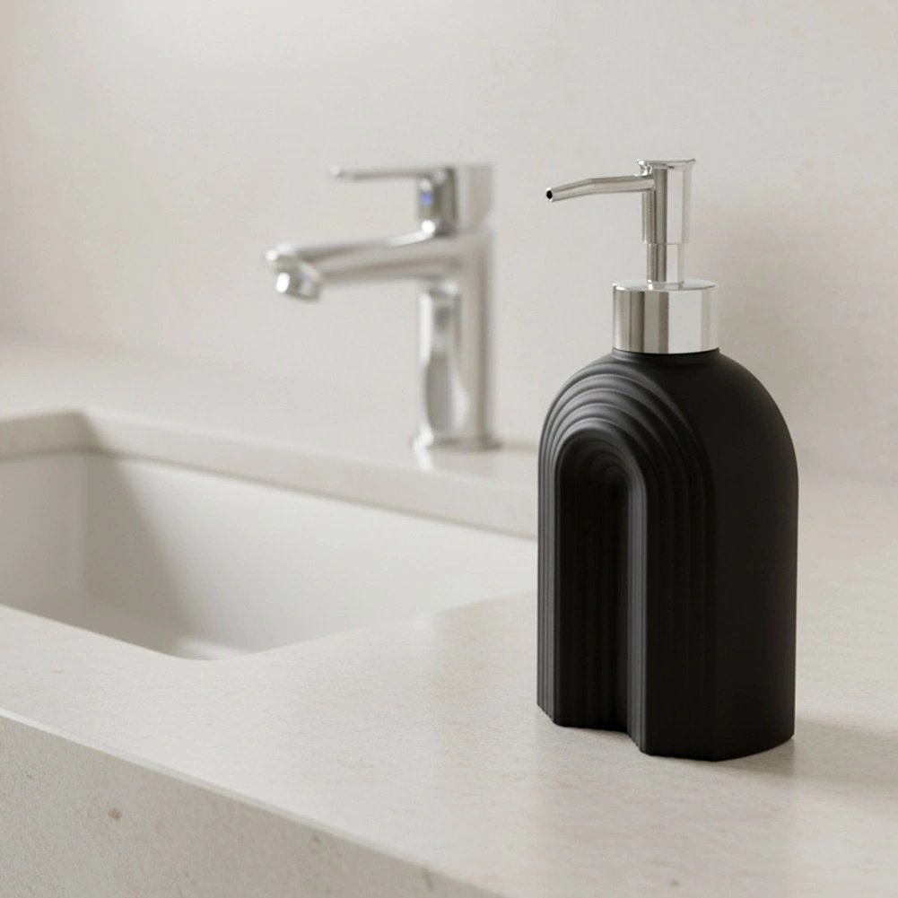 Det riflede glaskorpus i elegant sort med blank pumpe giver badeværelse og køkken et premium-look og forbedrer grebet under brug.