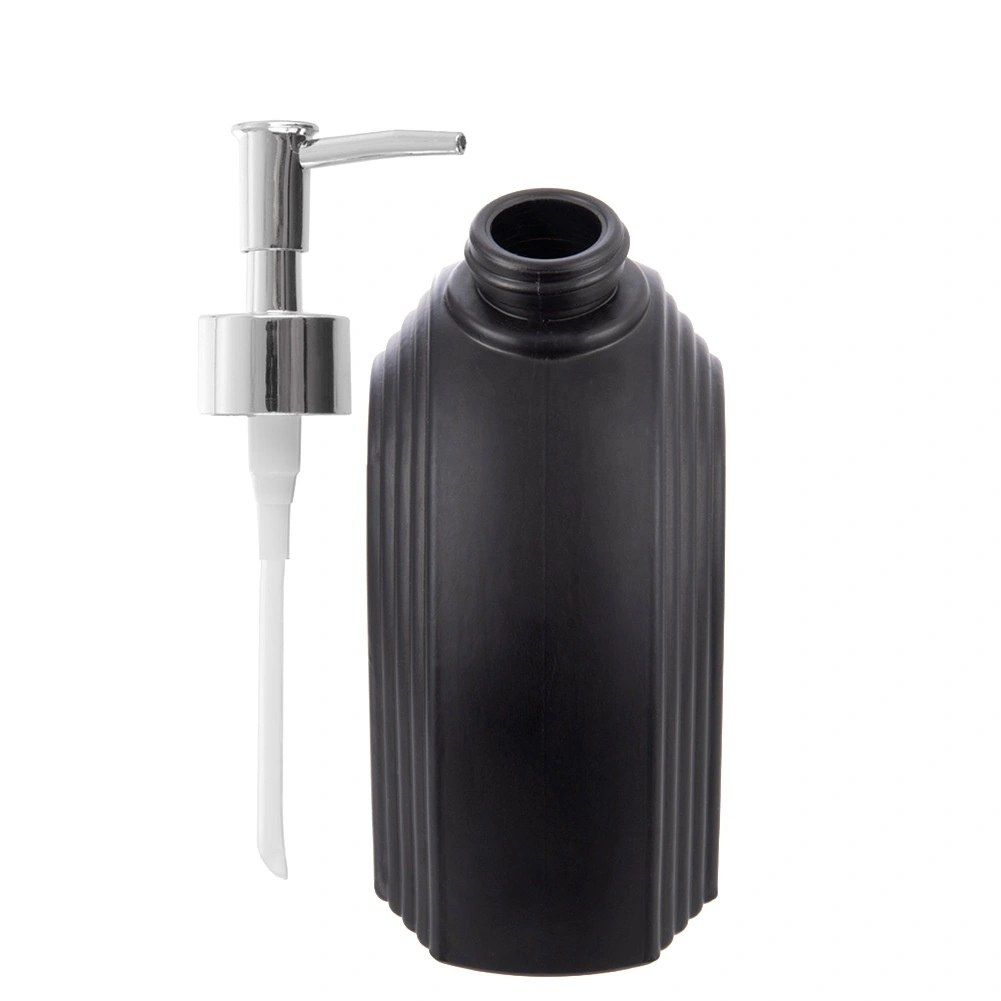 En stilfuld dispenser i kvalitetsglas i mat sort tilbyder et tidløst udtryk og praktisk anvendelse i den daglige husholdning. Den riflede, buede flaskeform giver et sikkert greb og fungerer som et dekorativt element, mens den metalblanke pumpe doserer sæbe eller creme præcist uden spild.