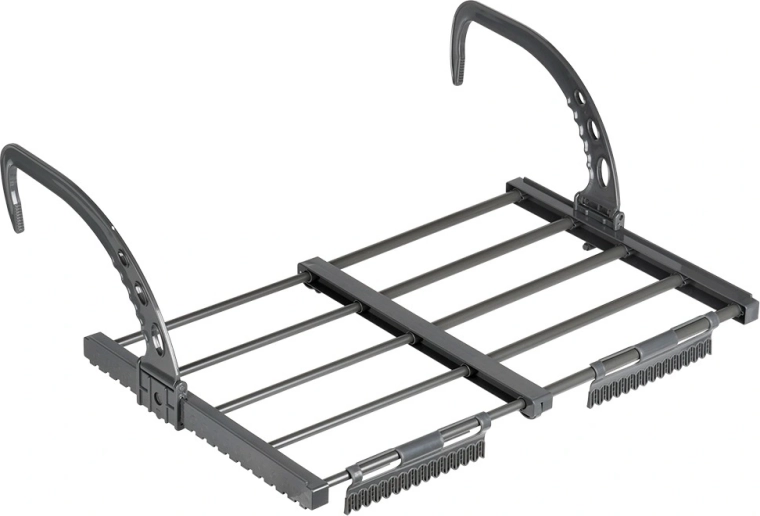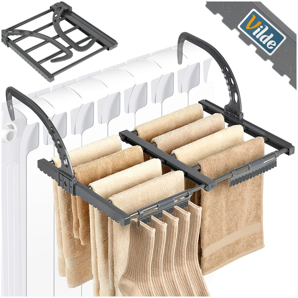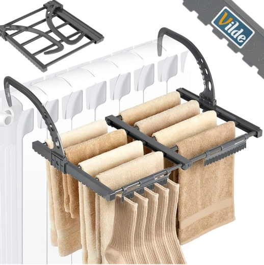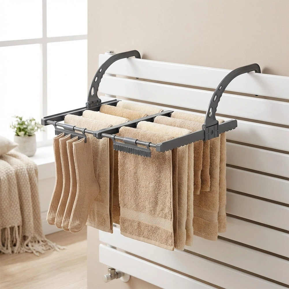 Alsidig anvendelse: på radiatoren i badeværelset eller værelset, men også på altan- eller terrassegelænder. Når det er foldet sammen, fylder det minimalt – en fremragende løsning til små husholdninger og på rejser.