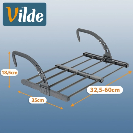 Takket være den udtrækkelige konstruktion 32,5–60 cm kan du tilpasse pladsen til den aktuelle mængde vasketøj. I alt 10 stænger (længder 26 og 28 cm) giver cirka 270 cm tørreflade – ideelt til undertøj, børnetøj, T-shirts eller håndklæder. To praktiske holdere til små dele gør det nemmere at tørre sokker eller undertøj.