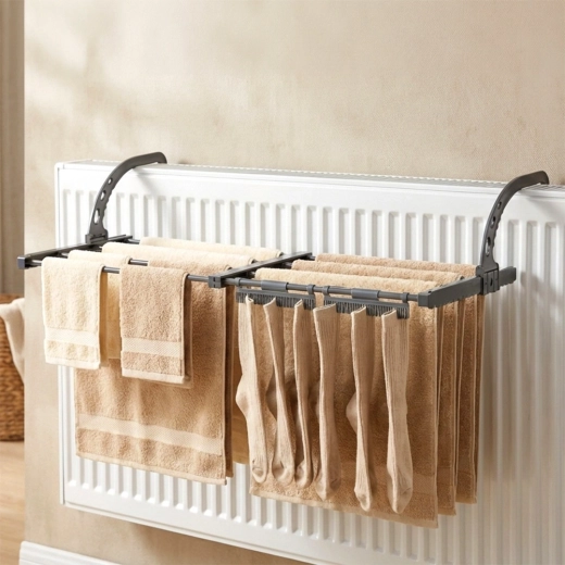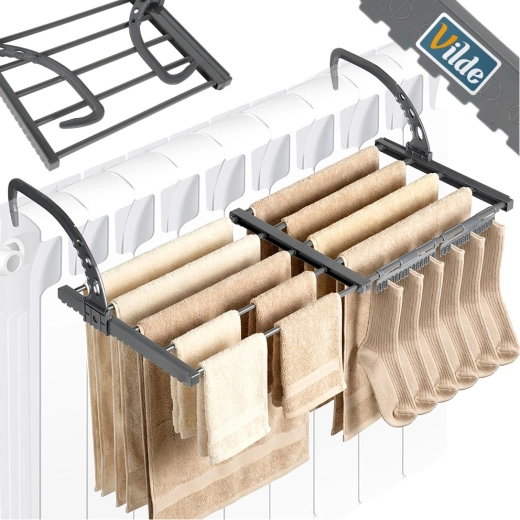 • Pladsbesparende – montering på radiator, sammenklappelig konstruktion, kompakt opbevaring.