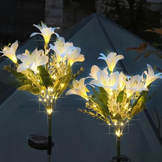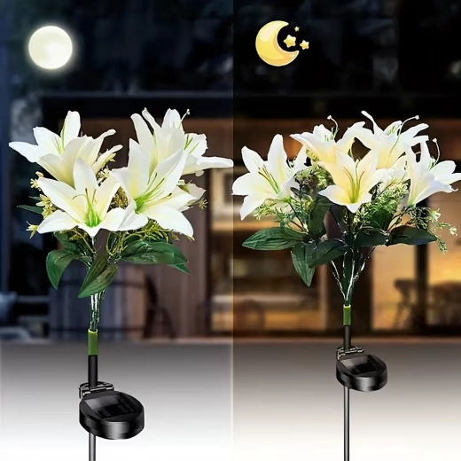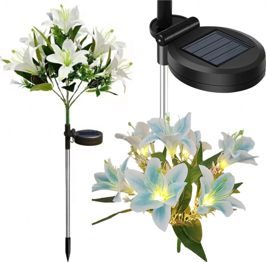 Skab en magisk stemning med en solcelledrevet dekorativ lampe formet som en lilje. Realistiske blomster og blade suppleres af et varmt LED-lys, der skinner blidt gennem kronbladene og fremhæver bede, stier og krukker. Stik den blot i jorden, ret panelet mod solen, og det integrerede solpanel klarer resten.