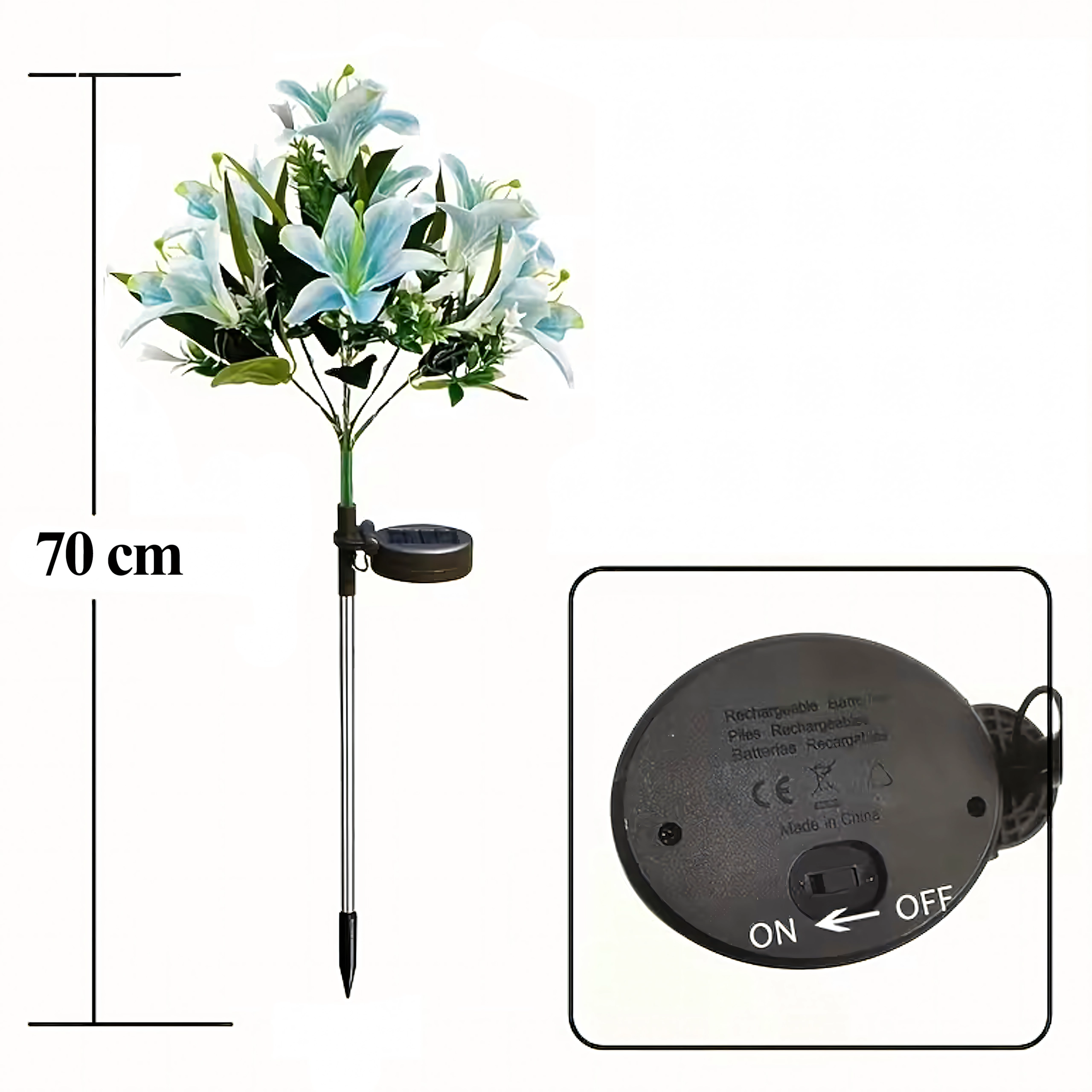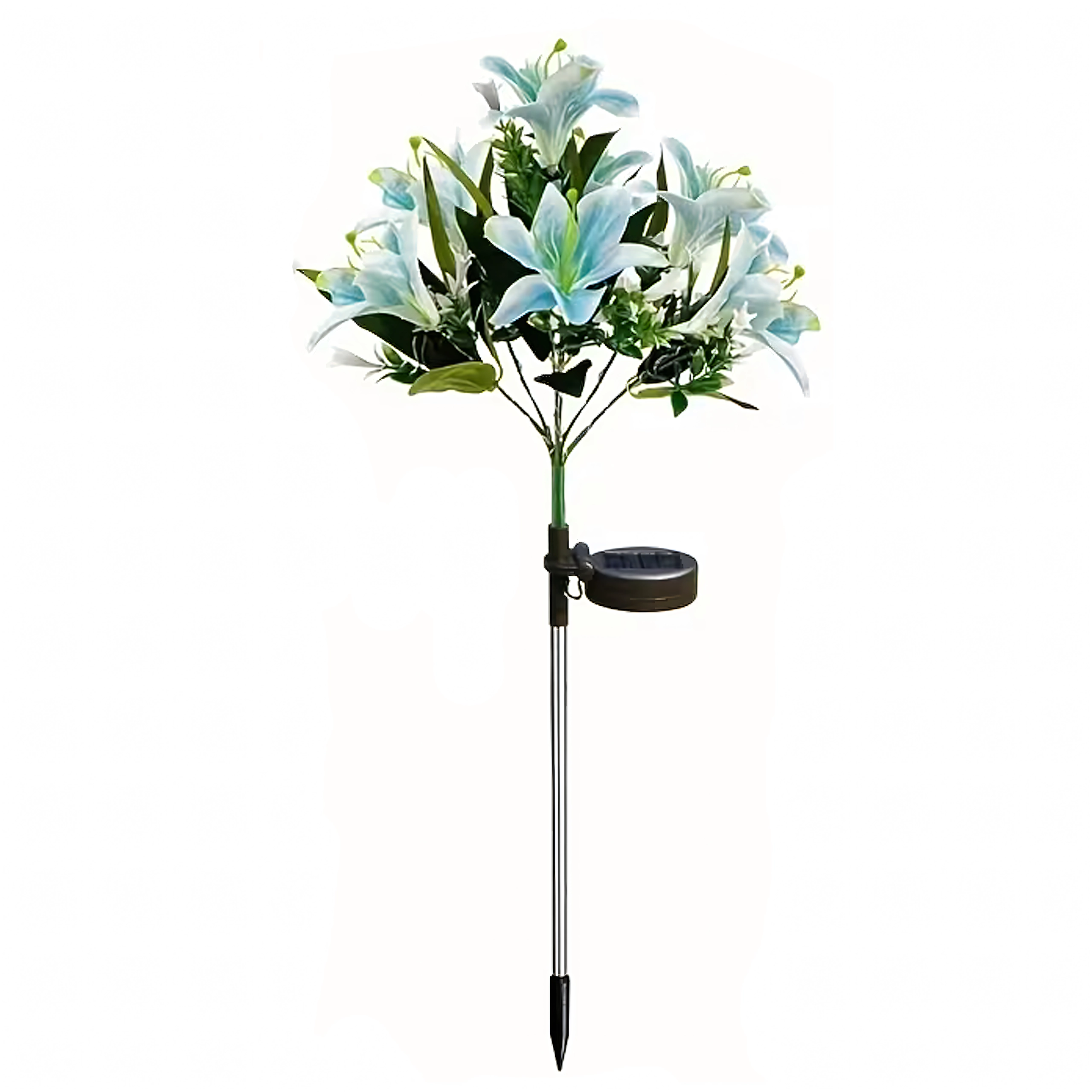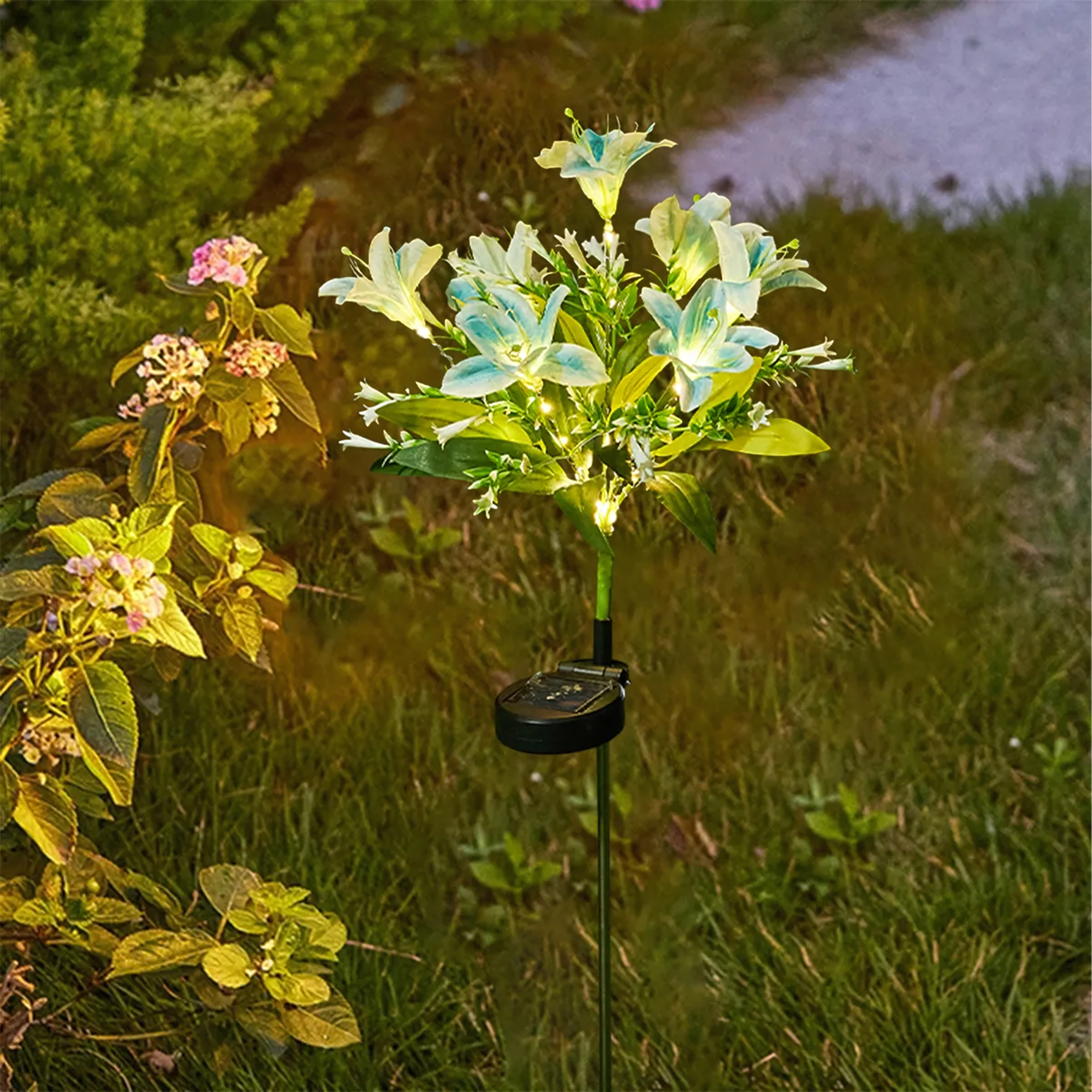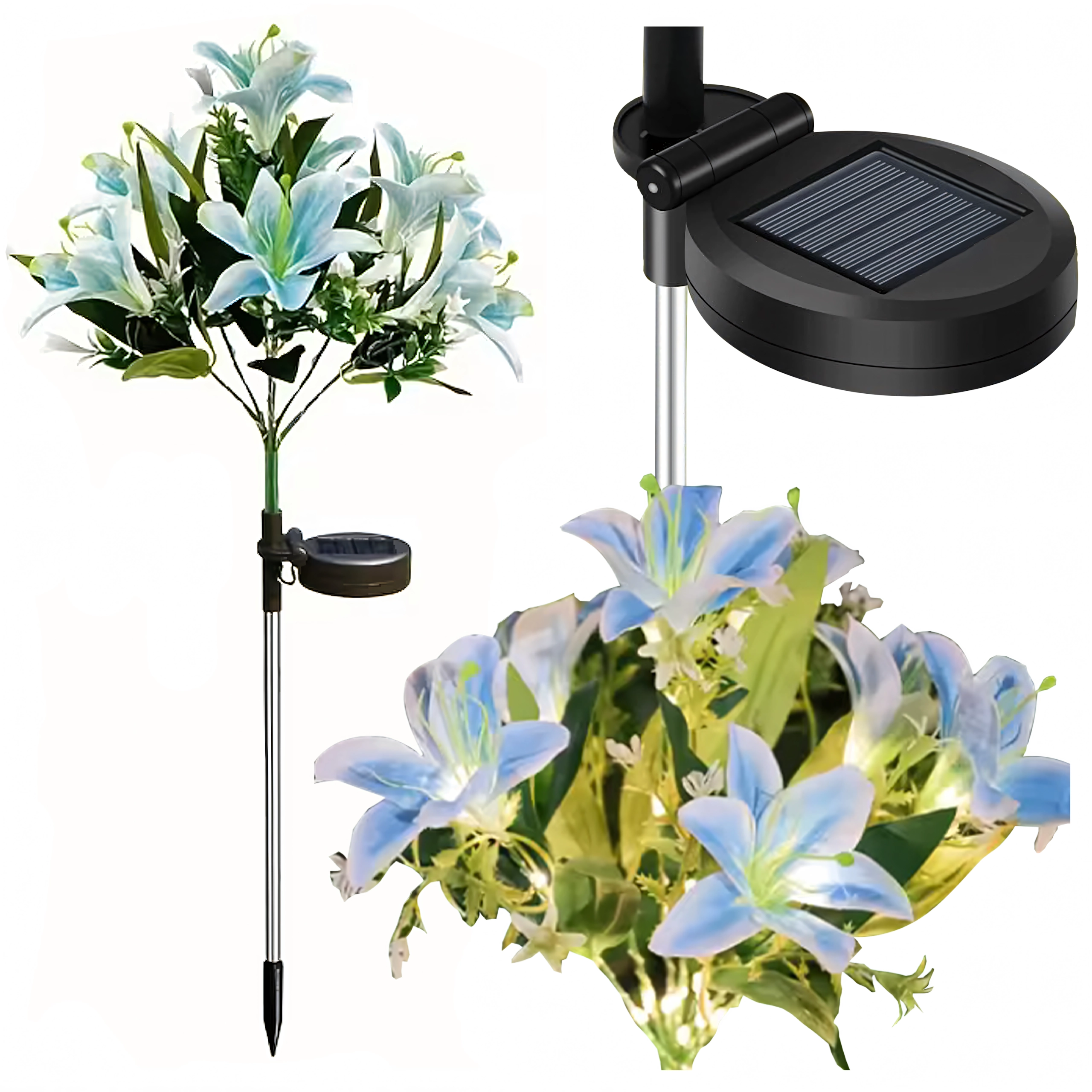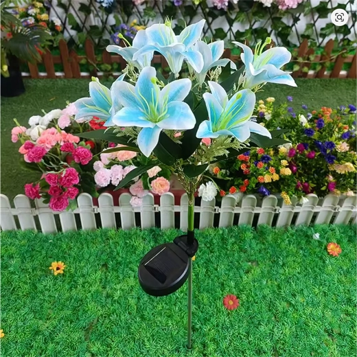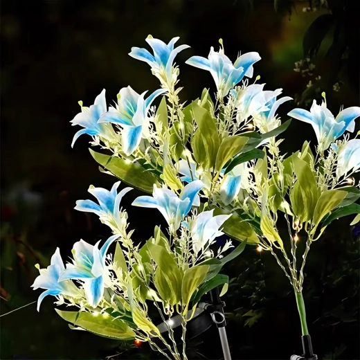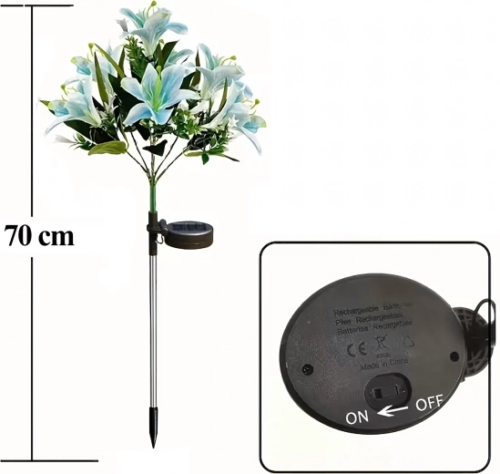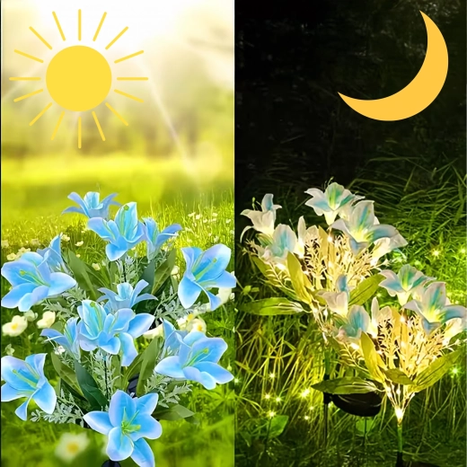 Den solcelledrevne havelampe i liljeform forvandler stier, blomsterbede og terrasser til et hyggeligt aftenparadis. I dagtimerne oplader det integrerede solpanel det indbyggede batteri, og efter mørkets frembrud tænder LED’erne automatisk for at få kronbladene til at gløde med et blidt lys. Realistiske blade og flere blomster på samme stilk giver et naturligt, dekorativt udtryk uden behov for vedligeholdelse.