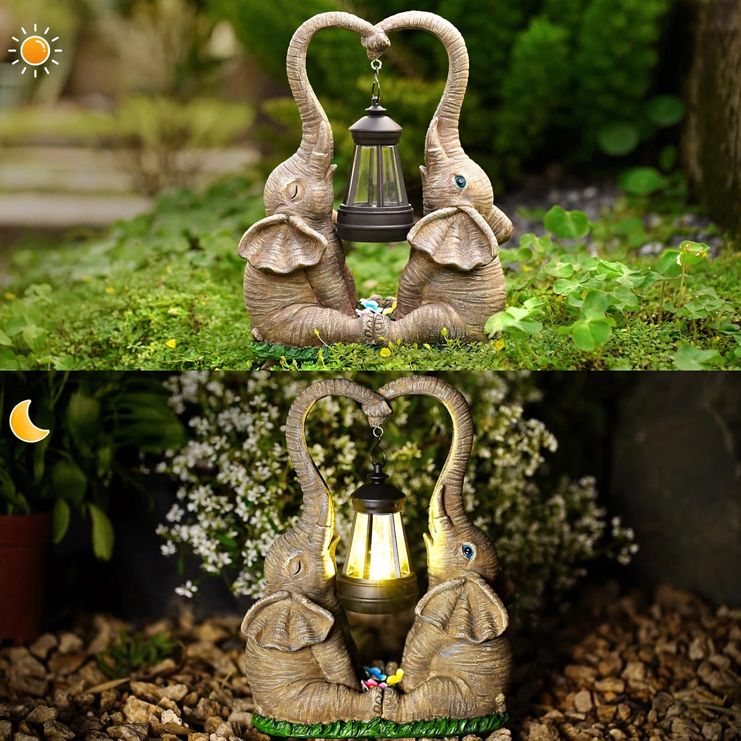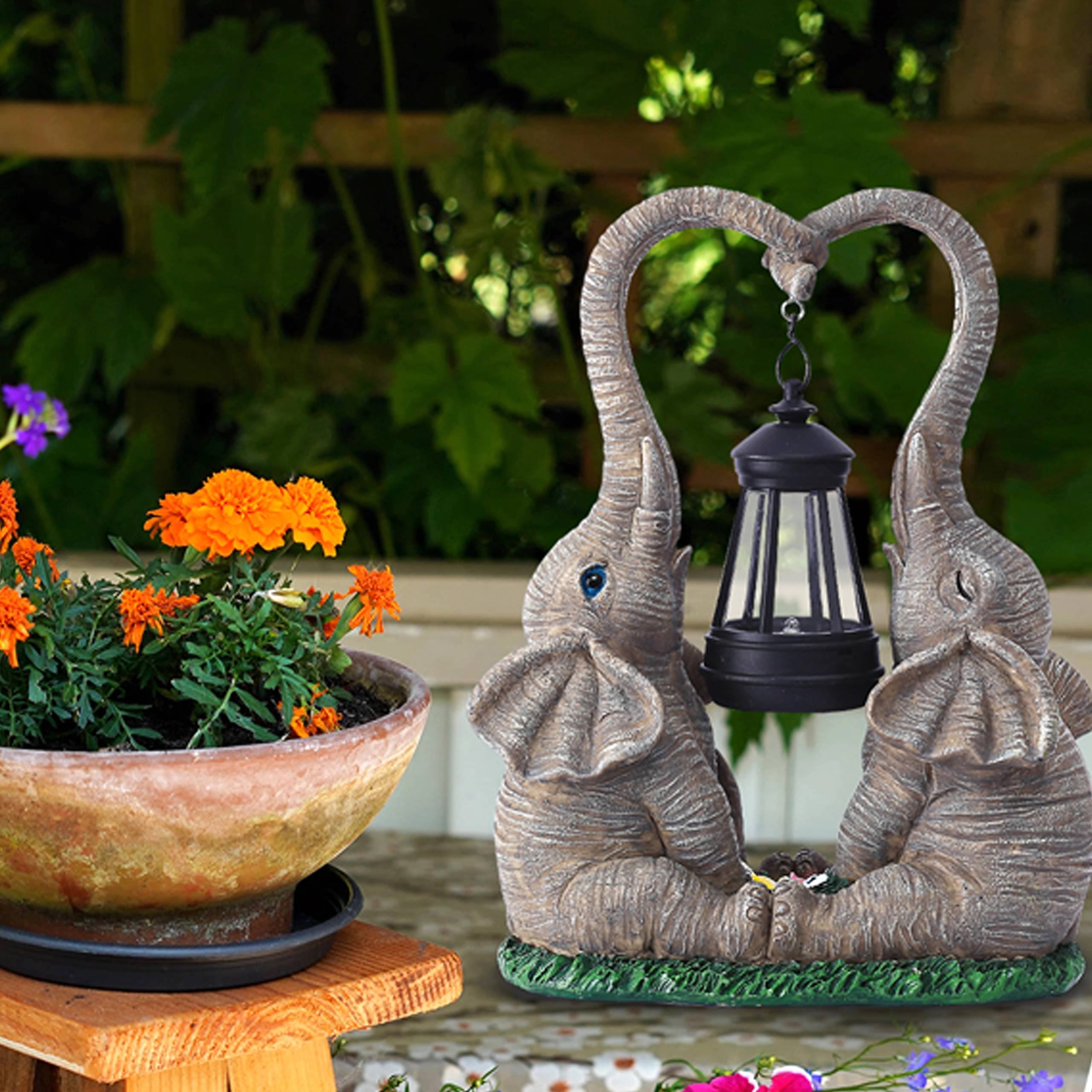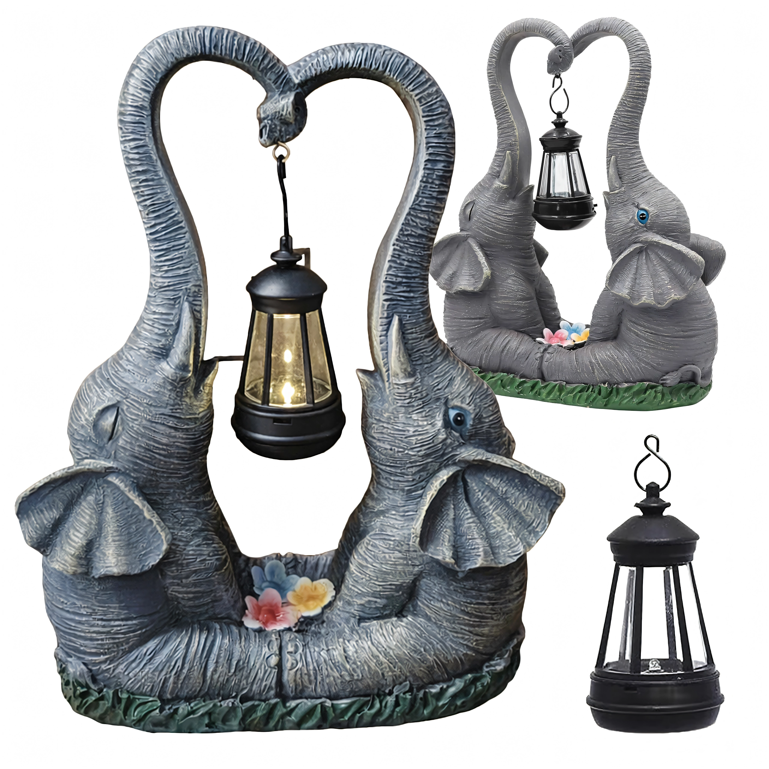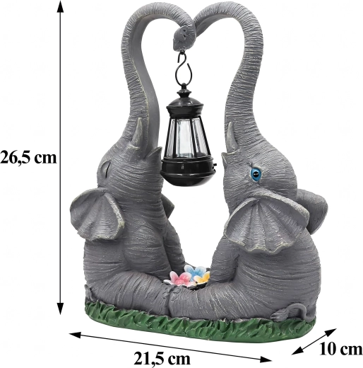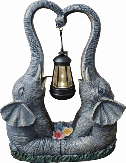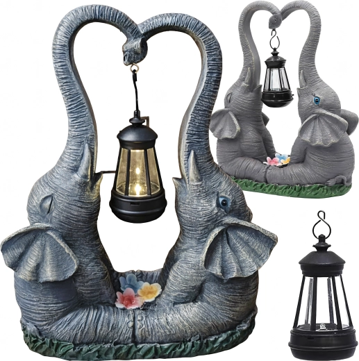 Denne dekorative lampe med to elefanter forener charmerende haveskulptur og praktisk stemningsbelysning. Lanternen, der hænger mellem snablerne, udsender et varmt lys, som fremhæver blomsterbede, vindueskarme og hyggekroge i haven.