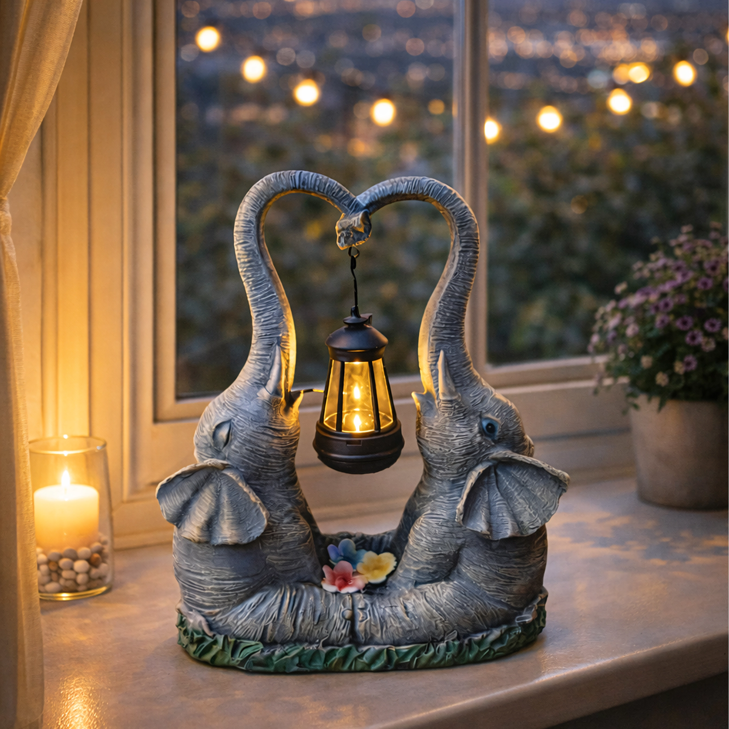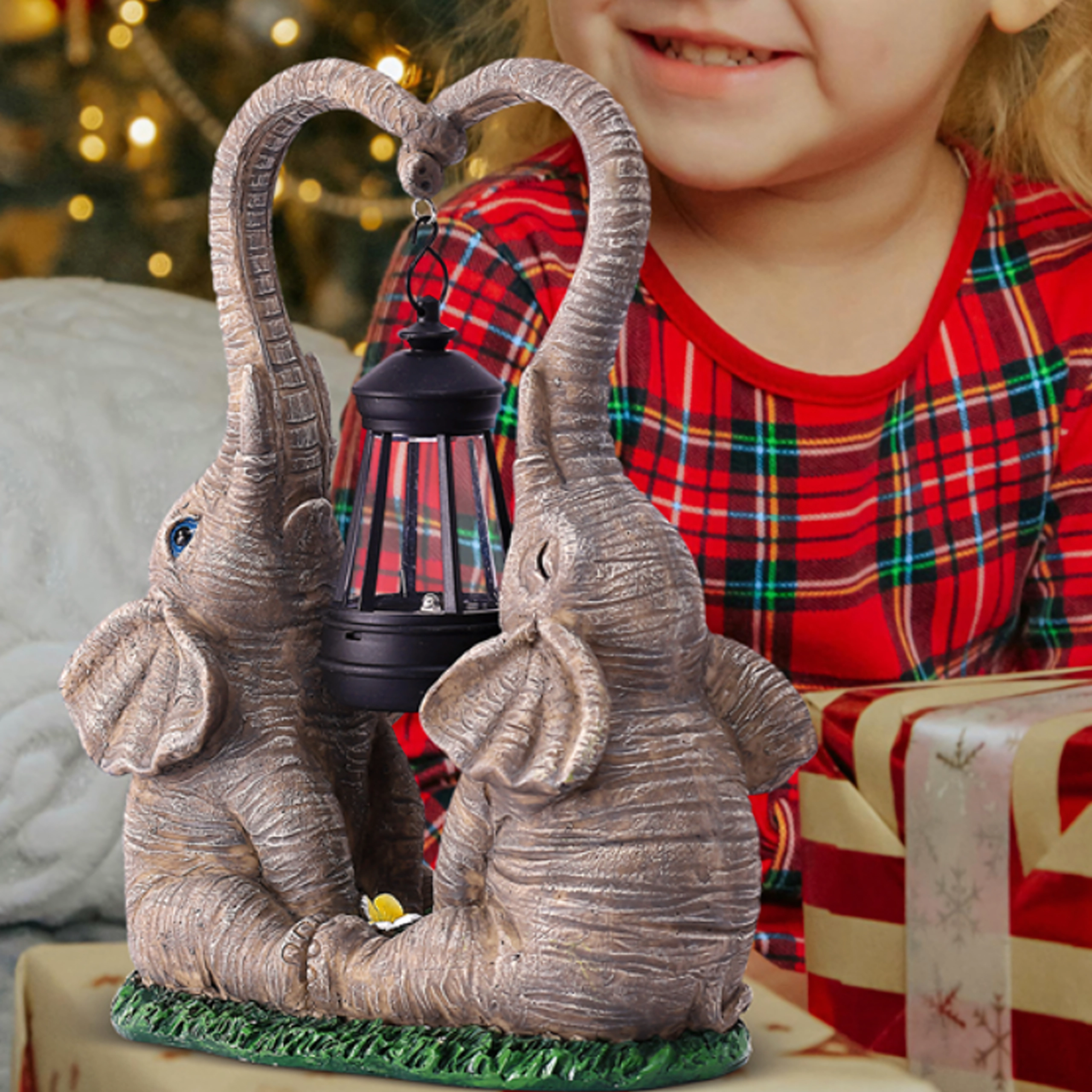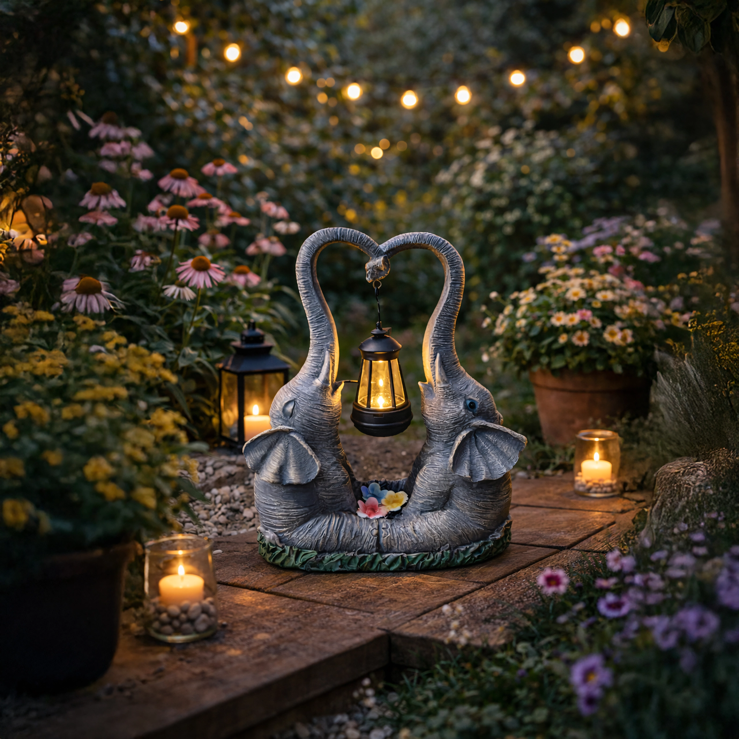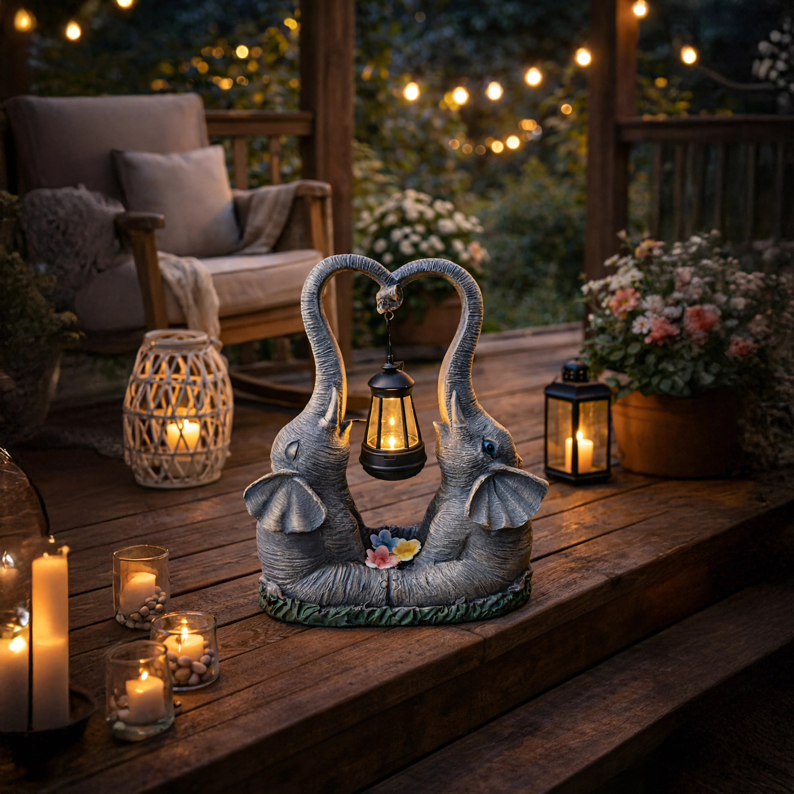 Denne dekorative lampe med to elefanter forener charmerende haveskulptur og praktisk stemningsbelysning. Lanternen, der hænger mellem snablerne, udsender et varmt lys, som fremhæver blomsterbede, vindueskarme og hyggekroge i haven.