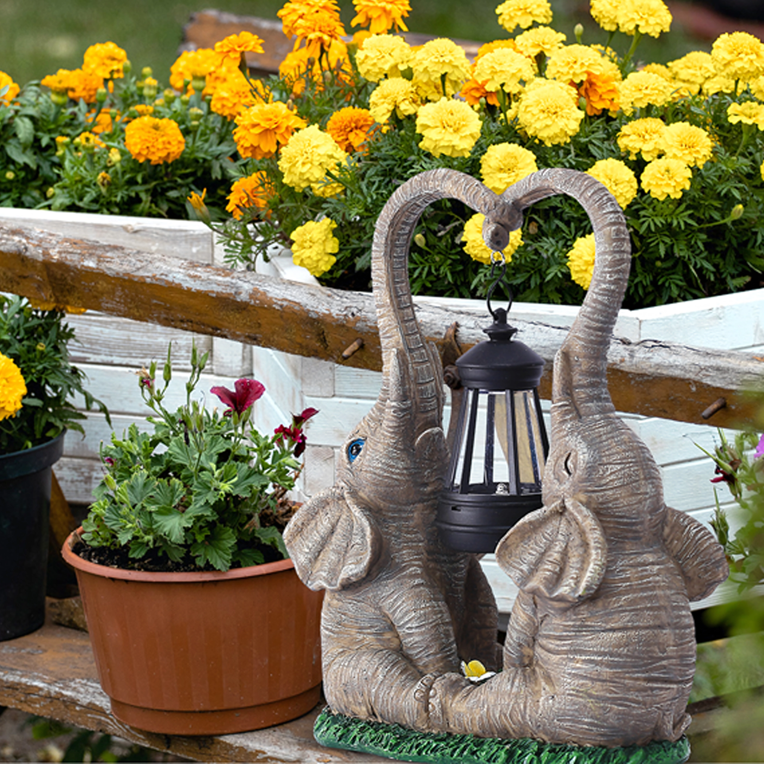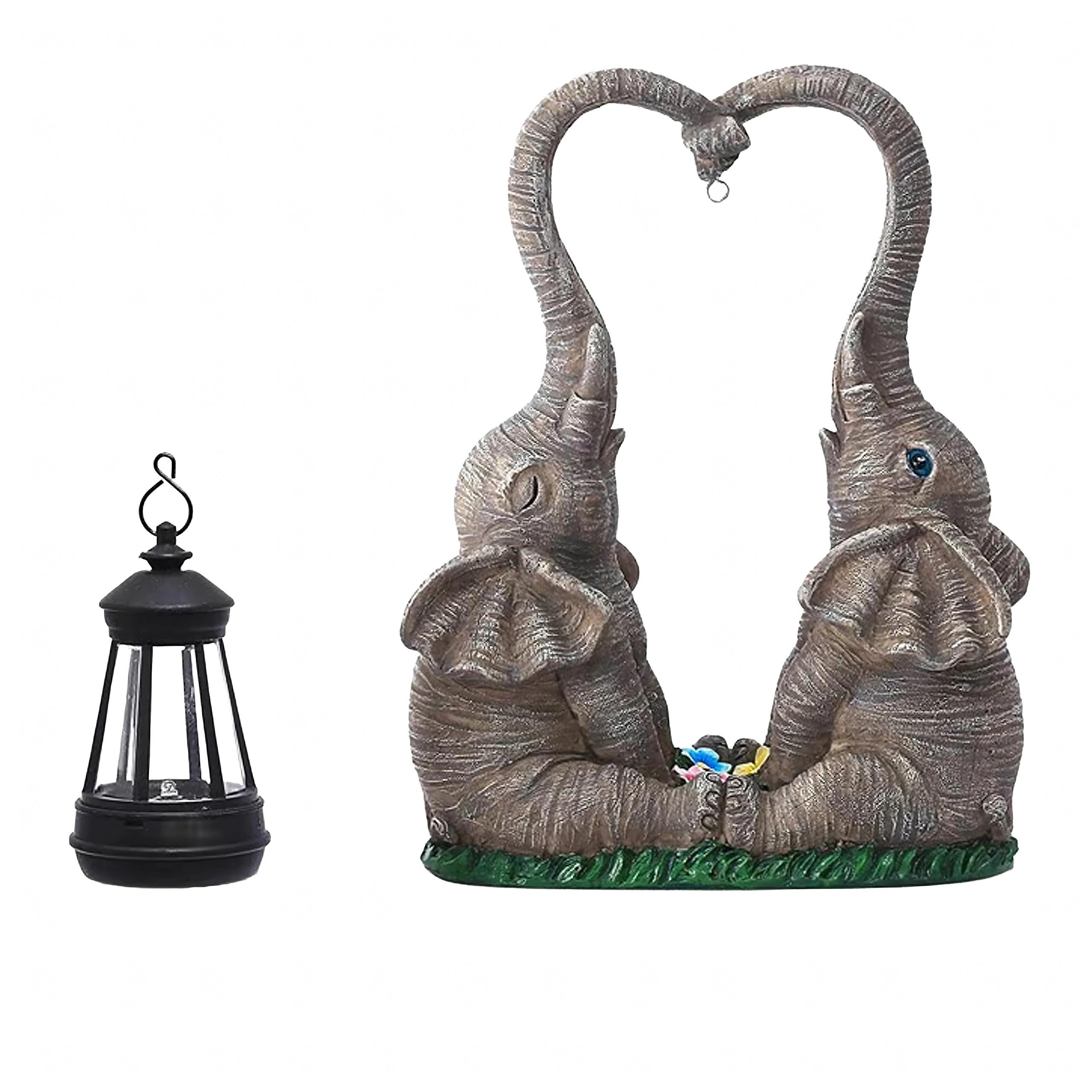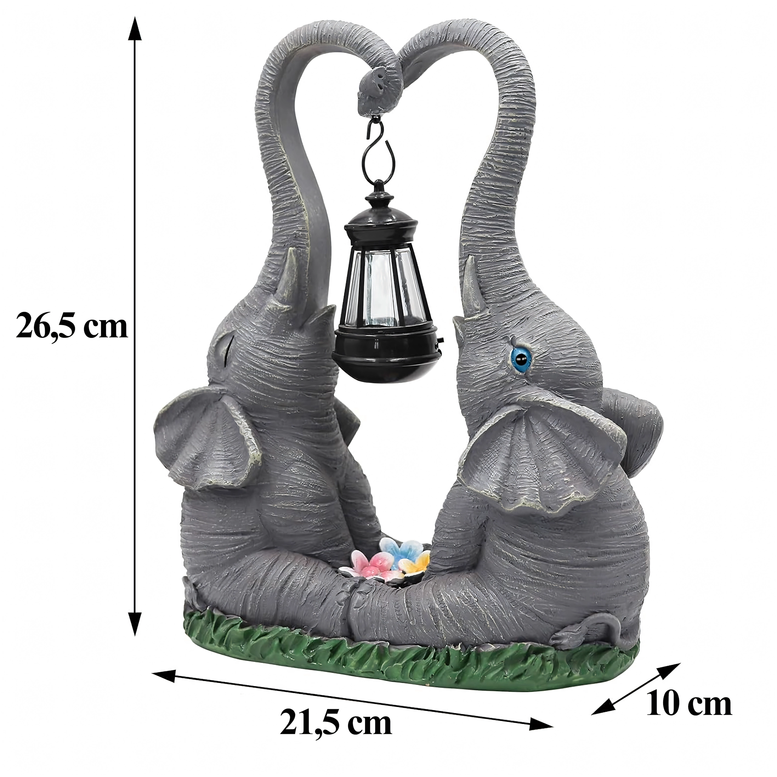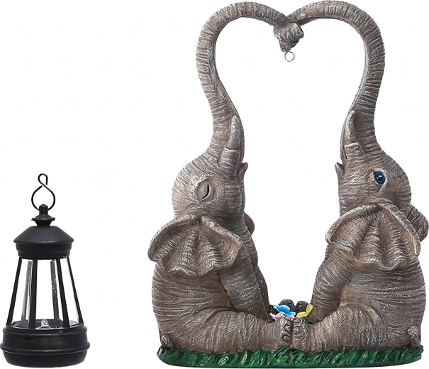 Sød havendekoration med to elefanter, hvis snabler danner et hjerte, bærer en hængende lanterne med varmt LED-lys. Den holdbare figur i harpiks passer perfekt til have, terrasse og altan og skaber en hyggelig stemning om aftenen. Ideel som gaveidé og som et stilfuldt element i udendørs belysning.