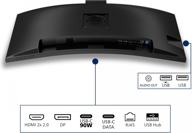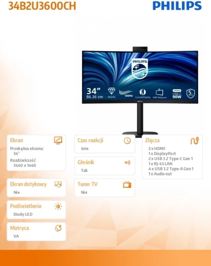 PHILIPS 34B2U3600CH er en 34" buet skærm designet til produktivitet, multitasking og underholdning. Ultrawide‑opløsning og VA‑teknologi giver brede betragtningsvinkler, høj kontrast og glidende billedkurver for behagelig visning uden øjentræthed. Med ét enkelt USB‑C kabel overfører du video, data og strøm, mens RJ45 sikrer en pålidelig netværksforbindelse.
