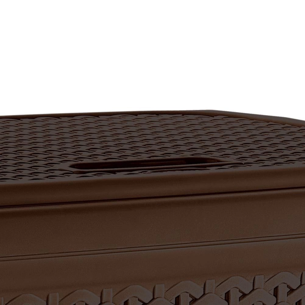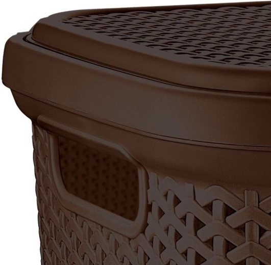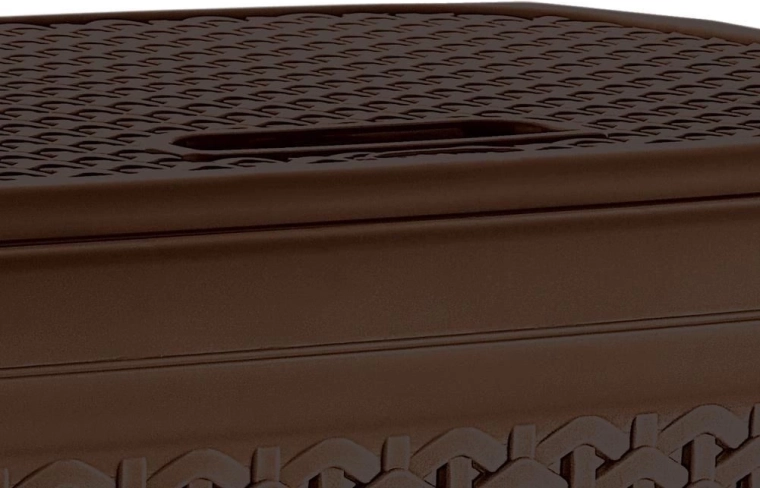 Kurven er fremstillet af let og holdbar plast i brun farve, som nemt matcher de fleste interiører. Det smalle design sparer plads – ideelt ved siden af vaskemaskinen eller i et hjørne. Integrerede sidehåndtag giver komfortabel transport.