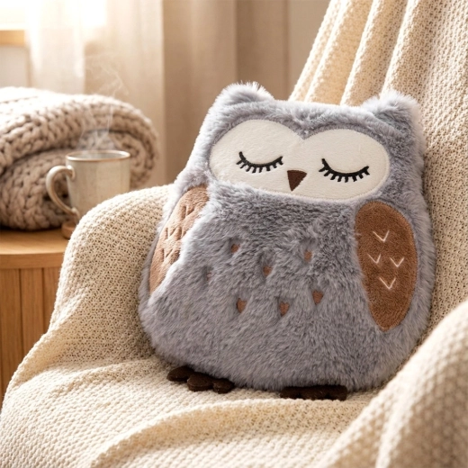 - Blødt betræk – blød plys i ugleform, behagelig mod huden.