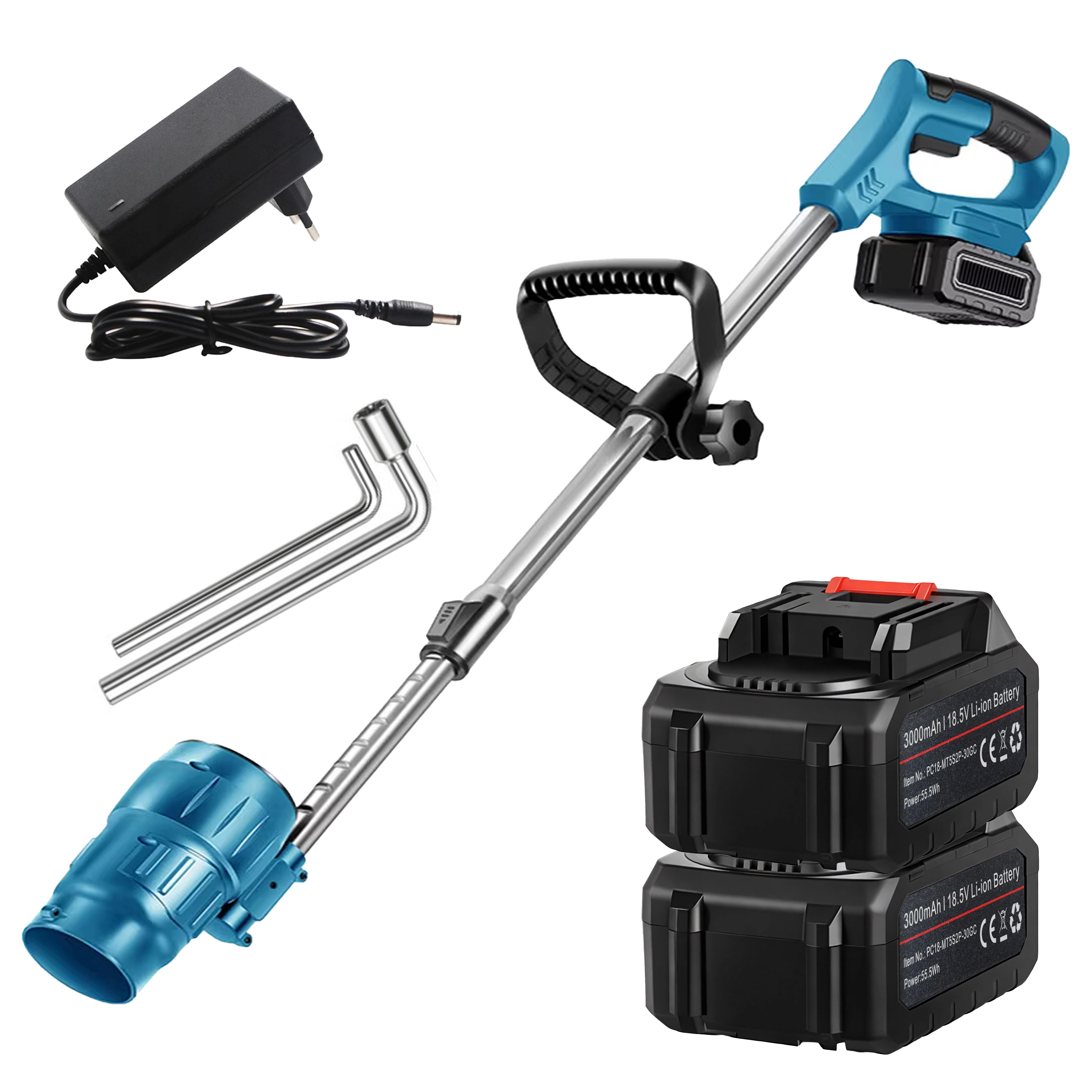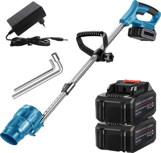 Pakken indeholder 2 kraftige Li‑ion-batterier 18,5 V / 3000 mAh samt en oplader, så du kan arbejde længere uden unødige pauser. Det sammenklappelige teleskopskaft gør det muligt at tilpasse værktøjets længde til din højde og den konkrete opgave og reducerer samtidig størrelsen for nem opbevaring.