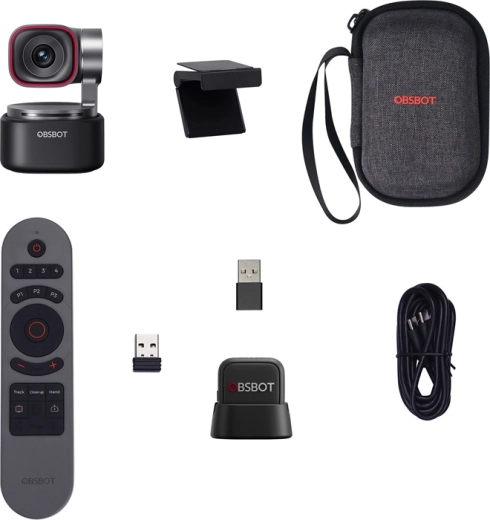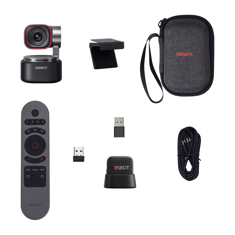 - OBSBOT Tiny 3 webkamera; OBSBOT Tiny Smart Remote 2; OBSBOT Vox SE mikrofon; Justerbart beslag; USB‑C–USB‑C‑kabel; USB‑C–USB‑A‑adapter; Etui