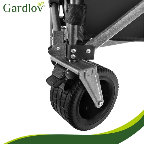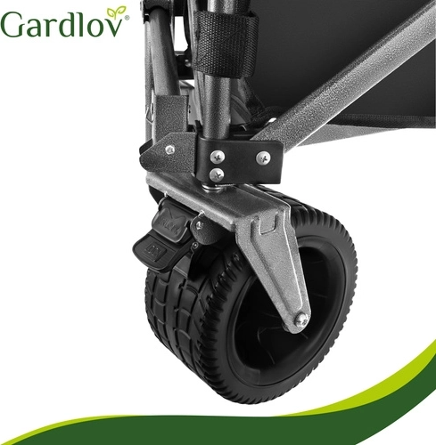 Brede gummihjul klarer sand, græs og grus. De 360° drejelige forhjul gør manøvren let selv ved fuld last, og forhjulene kan desuden låses med bremse.