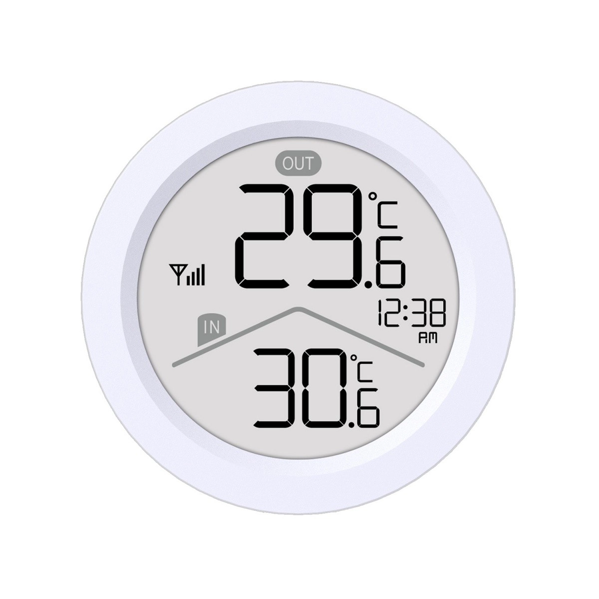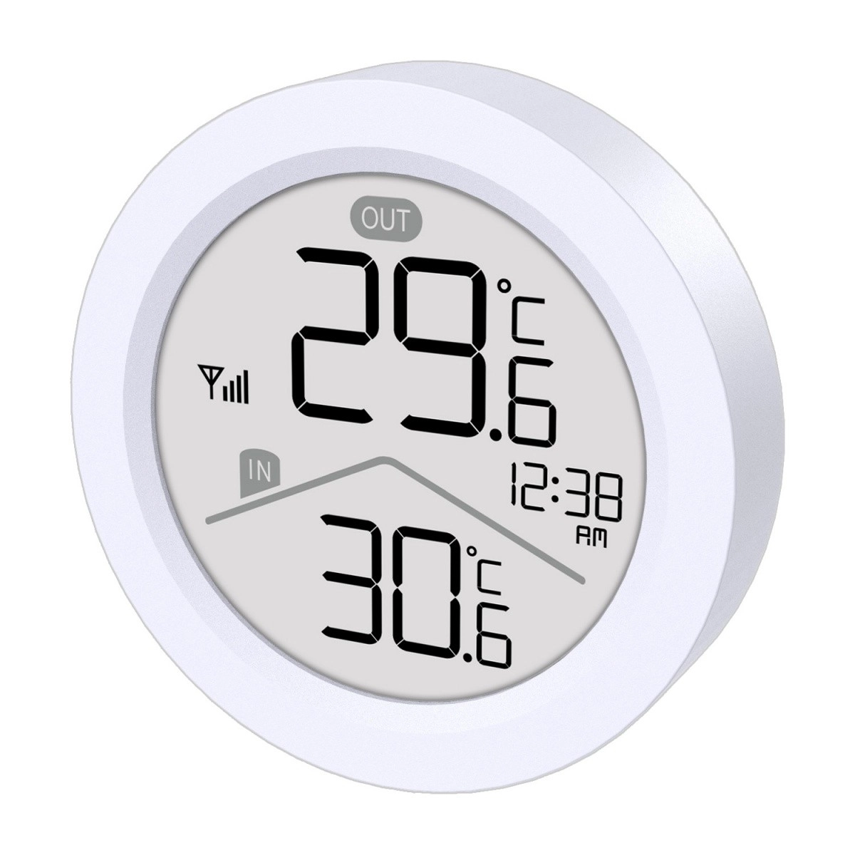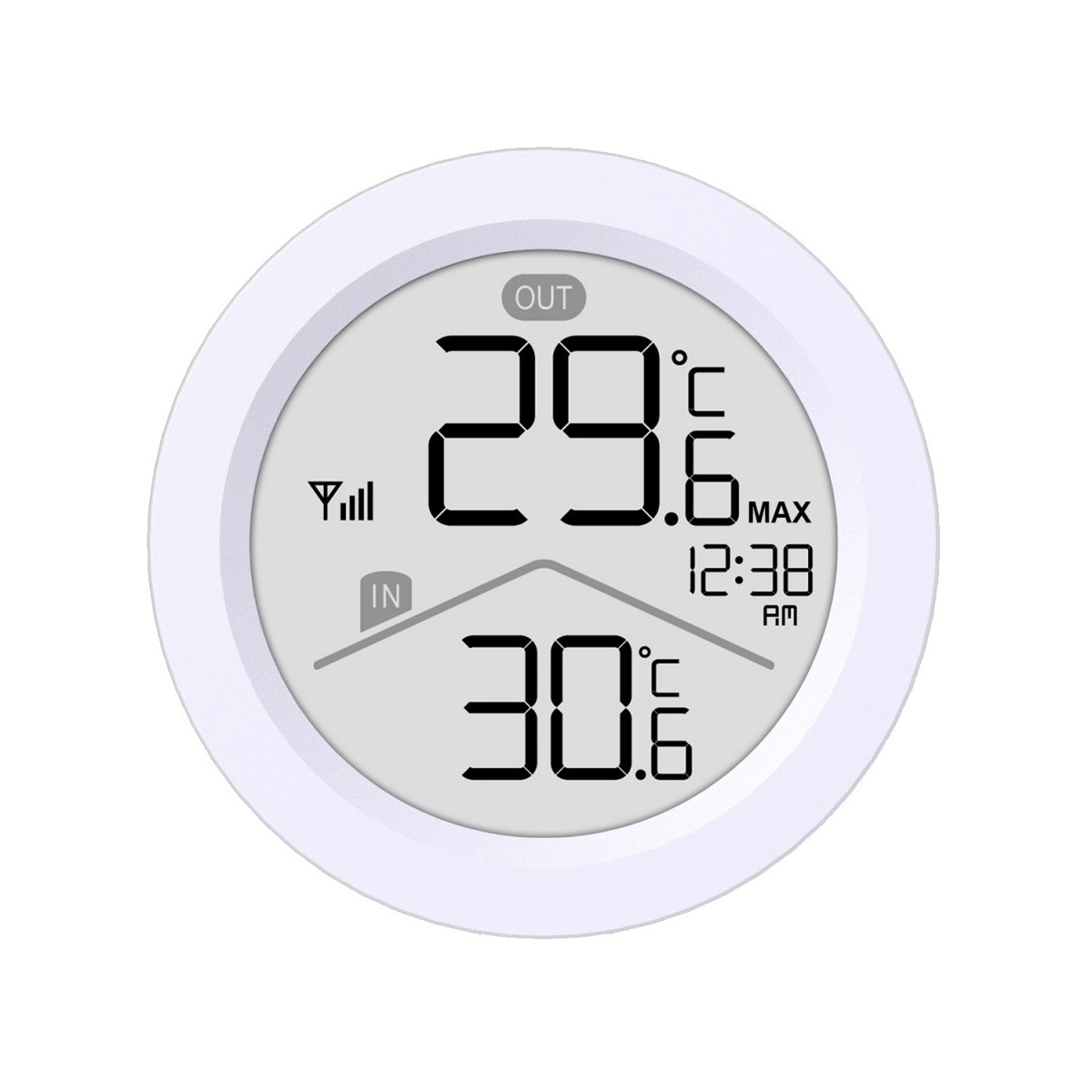 - LCD med store tal, IN/OUT-indikator, tid, signalikon