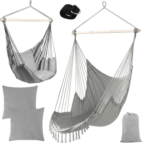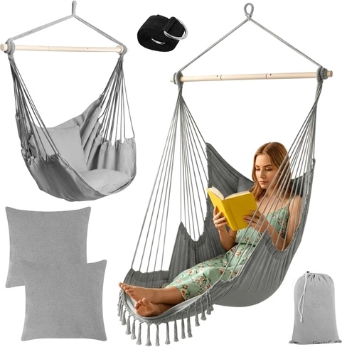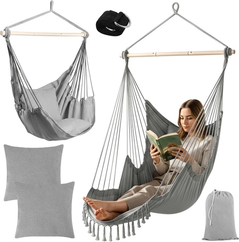 Alt, hvad du behøver, er inkluderet: 2 store puder for øjeblikkelig komfort, ophængsrem med metalring for hurtig installation og en opbevaringspose. Stofdelen kan maskinvaskes ved 30 °C, så vedligeholdelsen er let.
