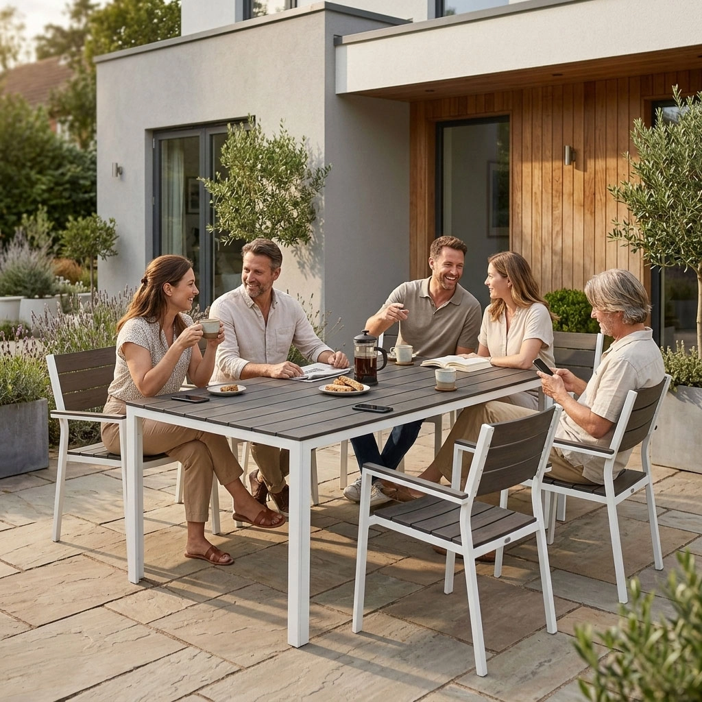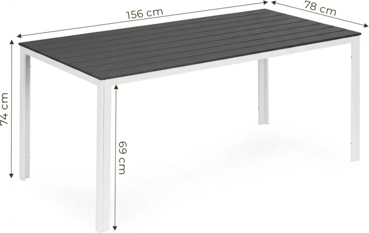 Det moderne havestebord MULTIGARDEN tilbyder behagelig siddeplads til 6 personer og en stor bordplade på 156 × 78 cm. Den robuste stålkonstruktion med overfladebehandling og en polywood-bordplade med træimitation sikrer vejrbestandighed, nem vedligeholdelse og stabilitet op til 150 kg. Ideelt til terrasse, altan og have.