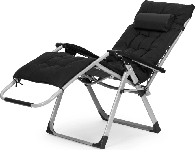 Der medfølger en stor, blød pude med hovedpude, som nemt sikres med stropper og en øvre overkant, så den ikke glider. Skridsikre fødder øger stabiliteten og beskytter underlaget mod ridser. Takket være den sammenklappelige udførelse kan liggestolen let opbevares eller tages med i sommerhus eller til stranden.