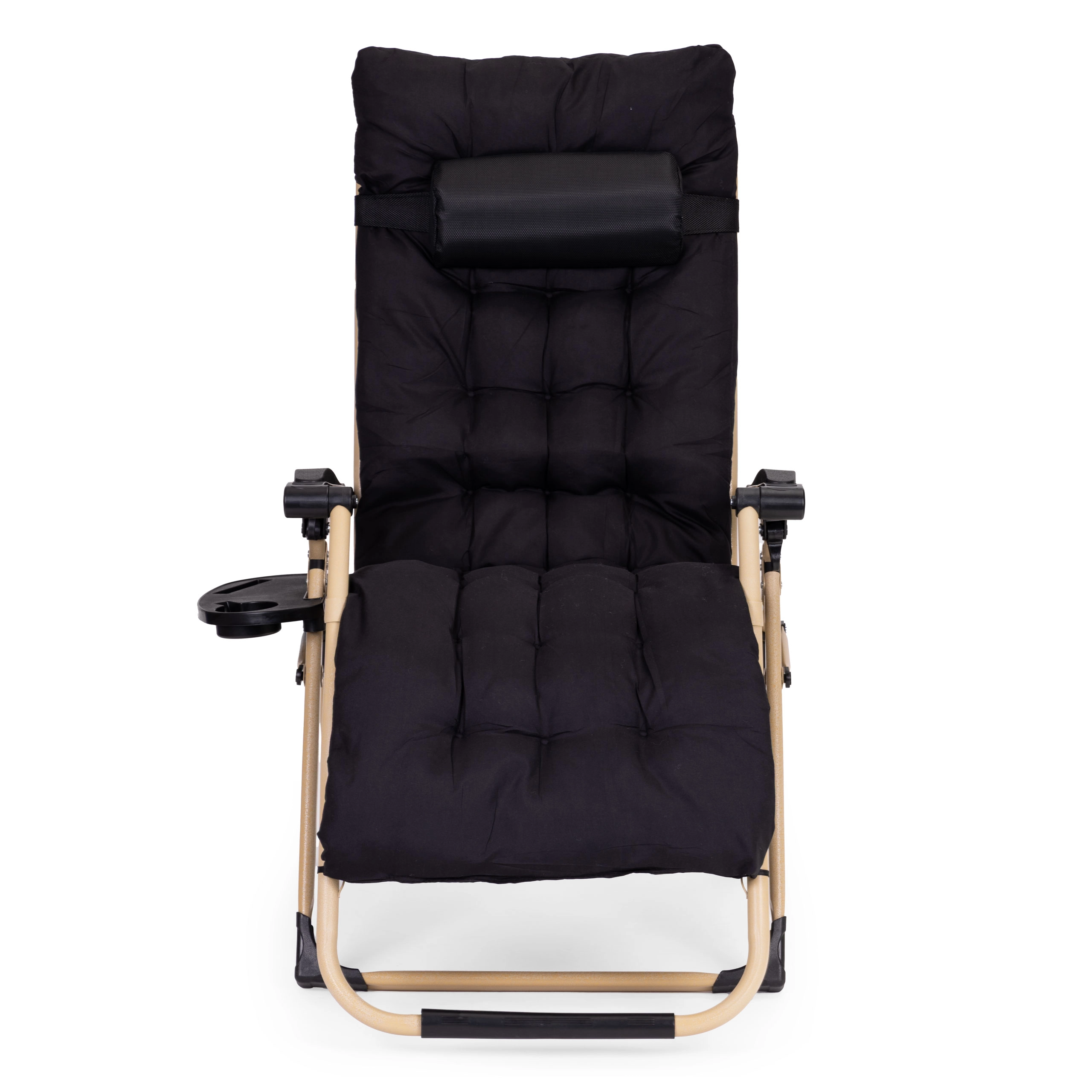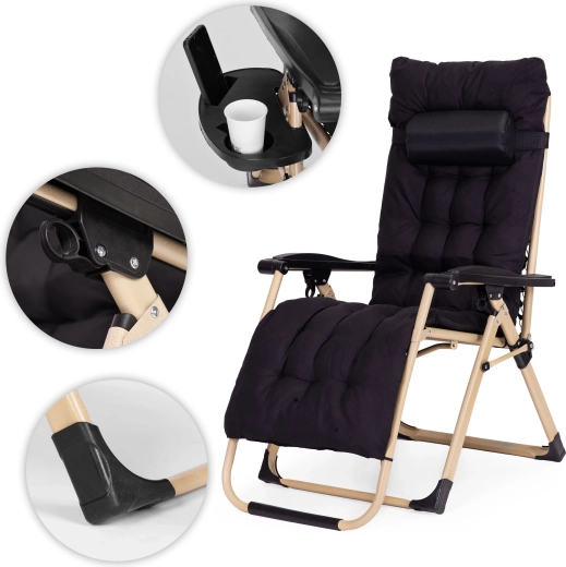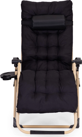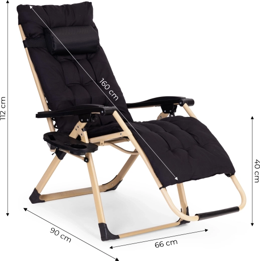 Takket være trinløs justering og en låsemekanisme indstiller du nemt den ideelle liggevinkel. Zero-Gravity-positionen aflaster ryggen og fremmer naturlig afslapning. Sidebordet med kopholder og plads til telefon holder alt det nødvendige inden for rækkevidde.